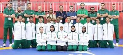 ومثل الأخضر في المحفل العالمي (10) لاعبين هم (خالد الشهراني، وعبدالله المشرف, وعبدالرحمن الشهراني, ومتعب بهاري, وعيسى مجرشي، وزيد آل علامة، وأحمد بن قاسم، ونواف حسين، وأنس القرنوس، ويوسف مداوي), وأربع لاعبات (ريما الناصر، وغرام كعبي، وأثير عسيري، ولتين مثنى)، تحت إشراف طاقم فني وإداري يضم، المدربان الوطنيان محمد القحطاني، وفهد الدويسان، والمدرب الروسي كربان بوغداييف، والأخصائيين محمد ازعوفي، وإبراهيم كداشي، ومهند الطاسان، والإداريين ضحى الرشيد وعلي الهاشم ومدير المنتخبات ناصر القحطاني.