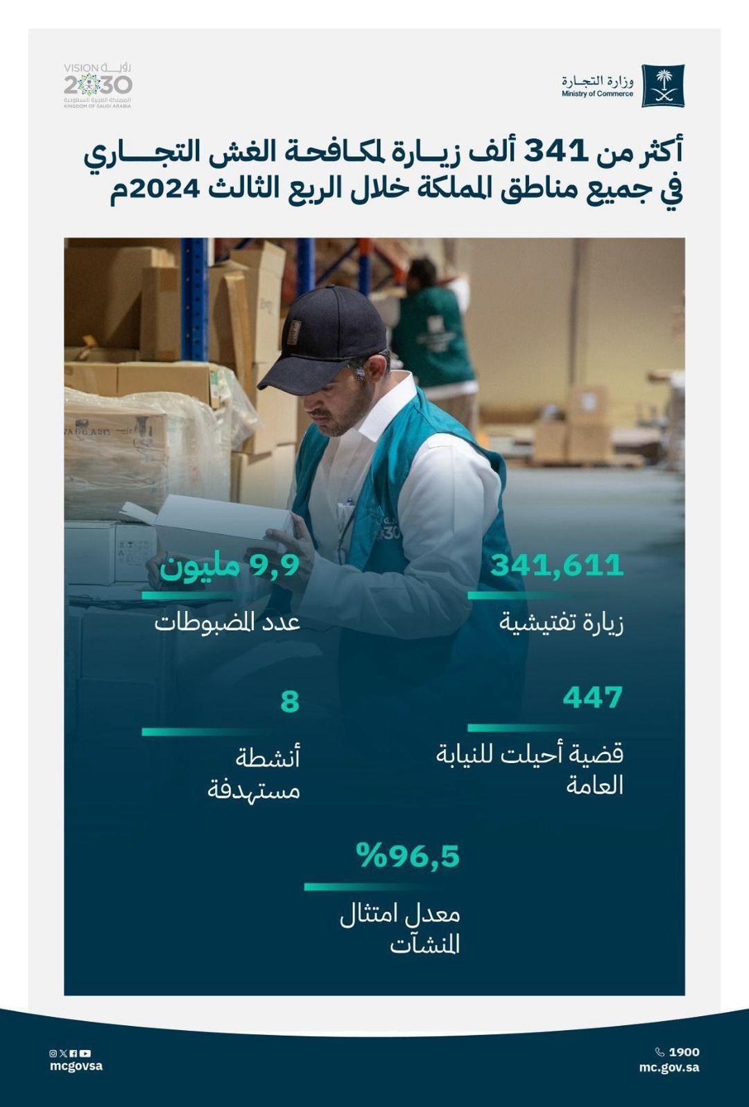 وتطرقت نشرة قطاع المستهلك إلى جهود الفرق الميدانية لوزارة التجارة التي نفذت أكثر من 341 زيارة تفتيشية على المنشآت التجارية في مختلف مدن ومحافظات المملكة خلال الربع الثالث من العام 2024م، وأسفرت عن ضبطت 9,9 ملايين منتج، فيما أحيلت 447 قضية غش تجاري إلى النيابة العامة لاستكمال تطبيق الإجراءات النظامية بحق المخالفين وفقًا لأنظمة حماية المستهلك.
