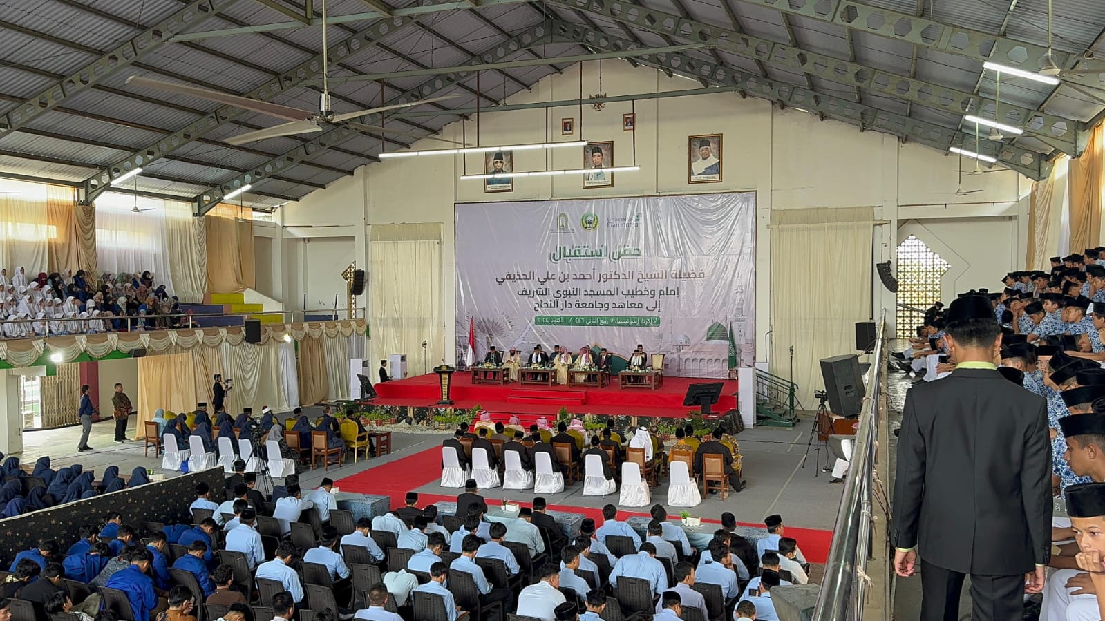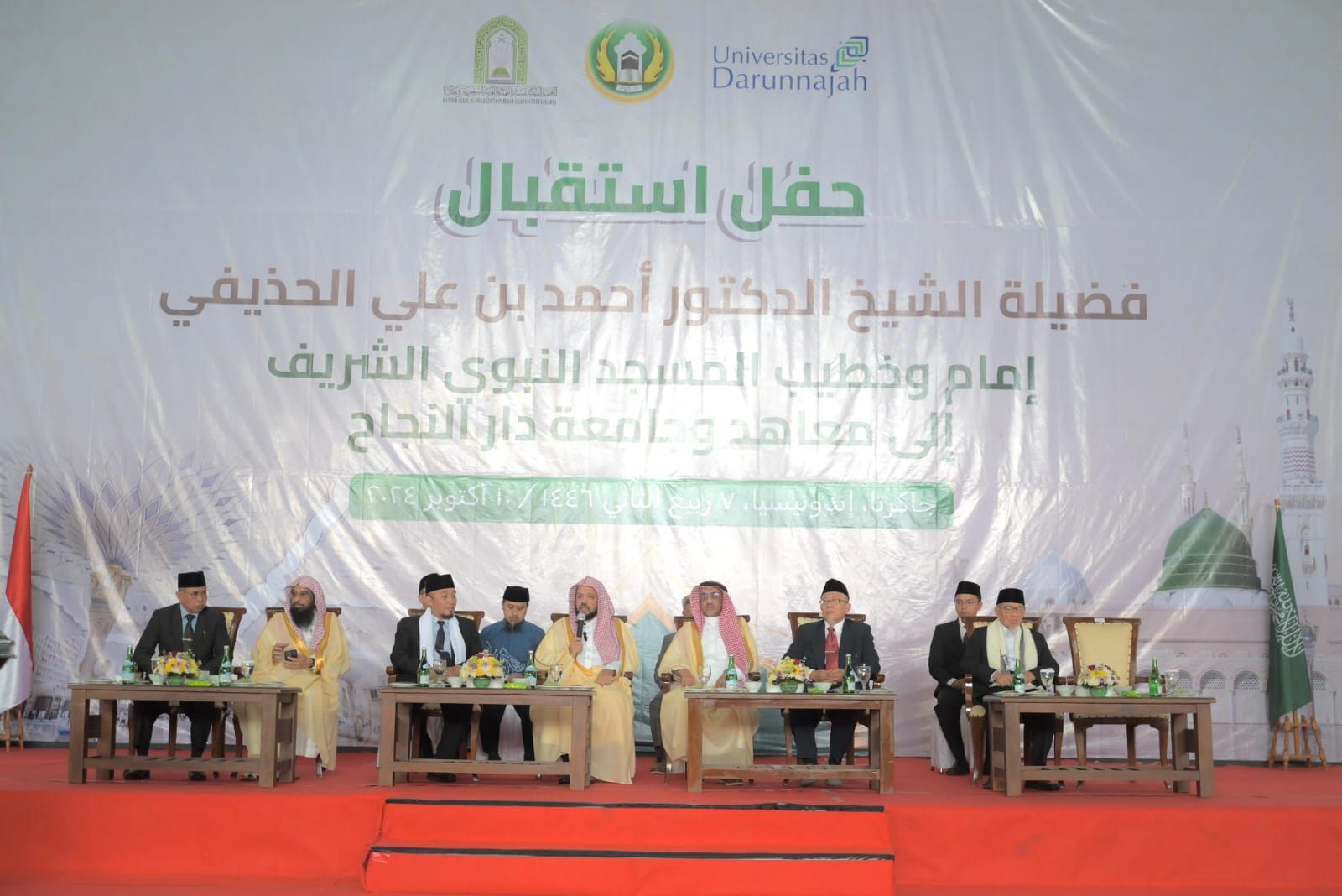 في مشهد بهيج يعكس محبة المسلمين وانتمائهم الروحي للحرمين الشريفين احتفى أكثر من 5000 طالب وطالبة بفضيلة إمام وخطيب المسجد النبوي، الشيخ الدكتور أحمد بن علي الحذيفي، اليوم الخميس السابع من ربيع الآخر لعام 1446هـ، الذي زار معهد وجامعة دار النجاح في العاصمة الإندونيسية جاكرتا وذلك ضمن برنامج زيارته الرسمية بتنسيق من وزارة الشؤون الإسلامية ممثلة بالملحقية الدينية بسفارة المملكة في جاكرتا
