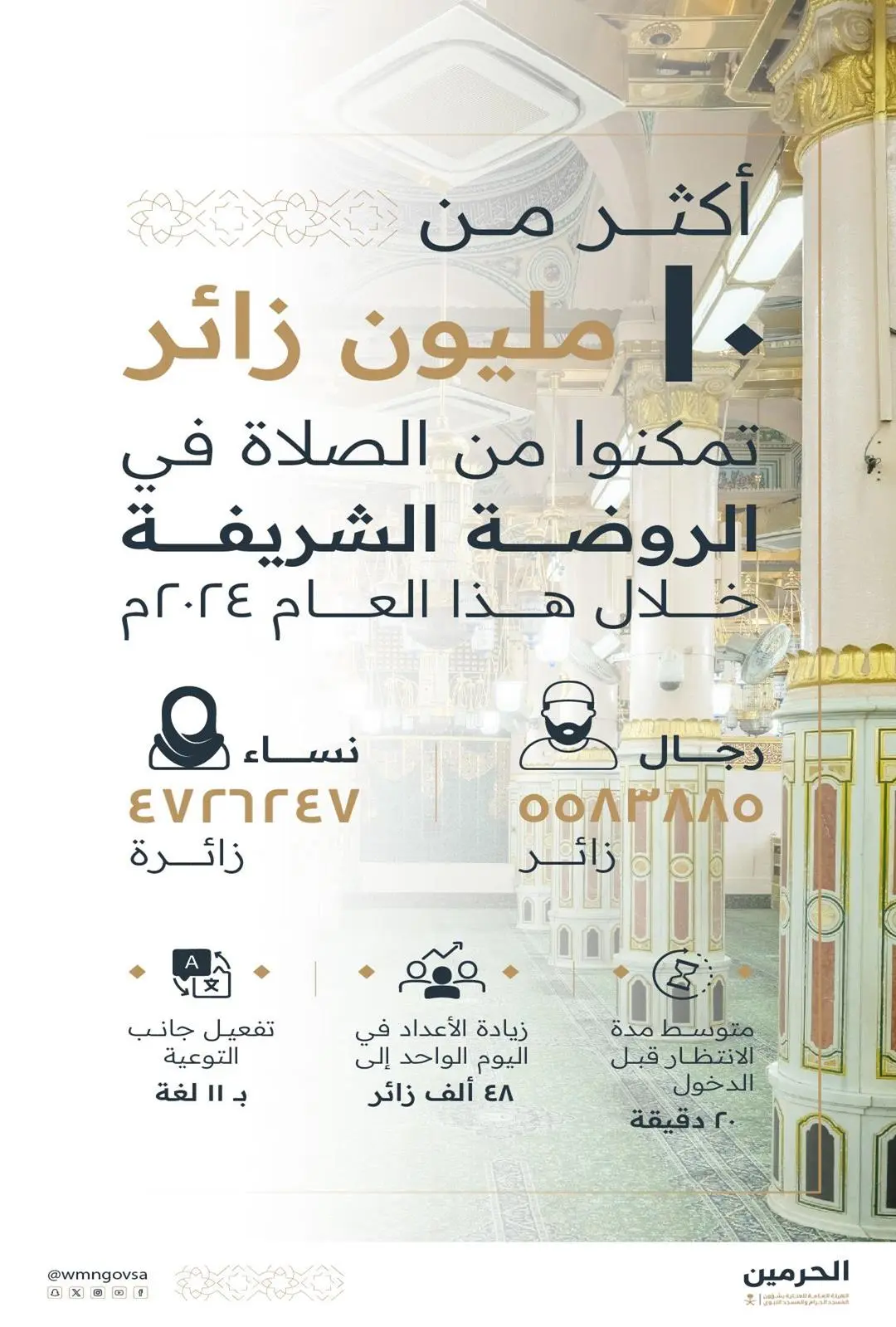 أكثر من 10 ملايين زائر للروضة الشريفة بالمسجد النبوي خلال عام 2024م
