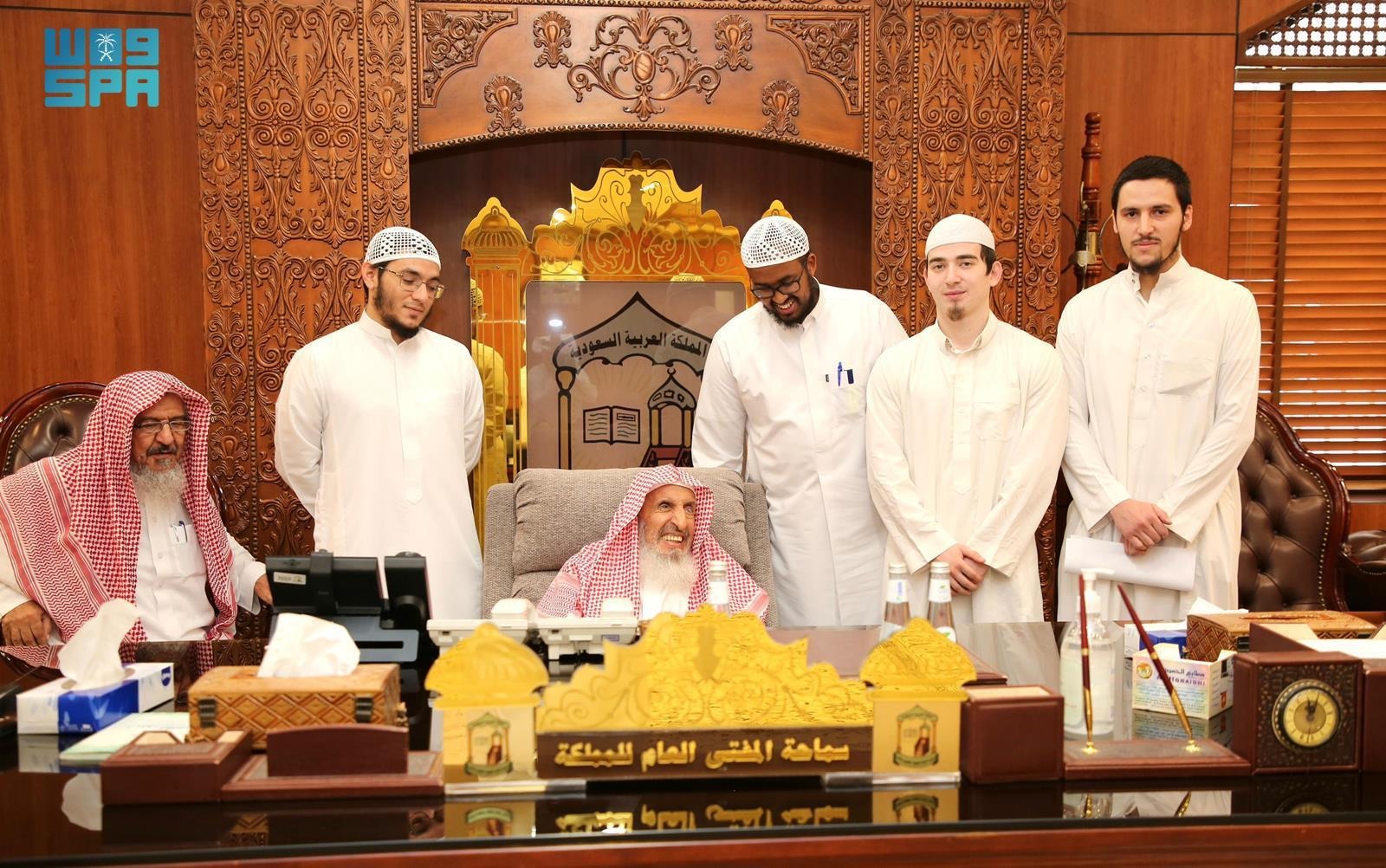 استقبل سماحة مفتي عام المملكة رئيس هيئة كبار العلماء والرئيس العام للبحوث العلمية والإفتاء الشيخ عبدالعزيز بن عبدالله بن محمد آل الشيخ، في مكتبه بالرئاسة العامة، وفدًا من طلاب المنح بجامعة الإمام محمد بن سعود الإسلامية من كندا، وروسيا الاتحادية، والبوسنة والهرسك.