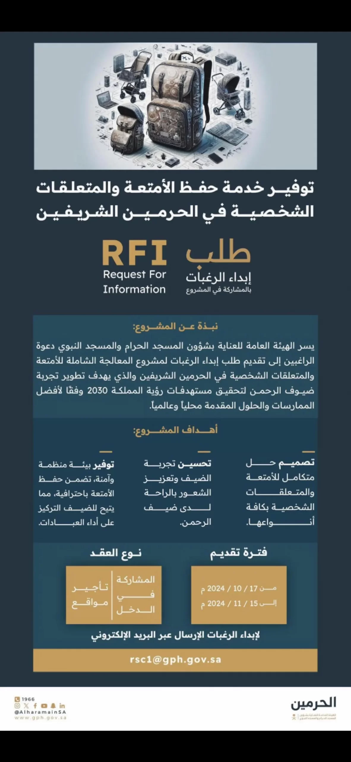 بدأت الهيئة العامة للعناية بشؤون المسجد الحرام والمسجد النبوي اليوم, تنفيذ مشروع توفير خدمة حفظ الأمتعة والمتعلقات الشخصية في الحرمين الشريفين، والمعالجة الشاملة لحفظ المتعلقات, الذي يهدف إلى تطوير تجربة ضيوف الرحمن من أجل راحتهم ليؤدوا مناسكهم في بيئة آمنة.