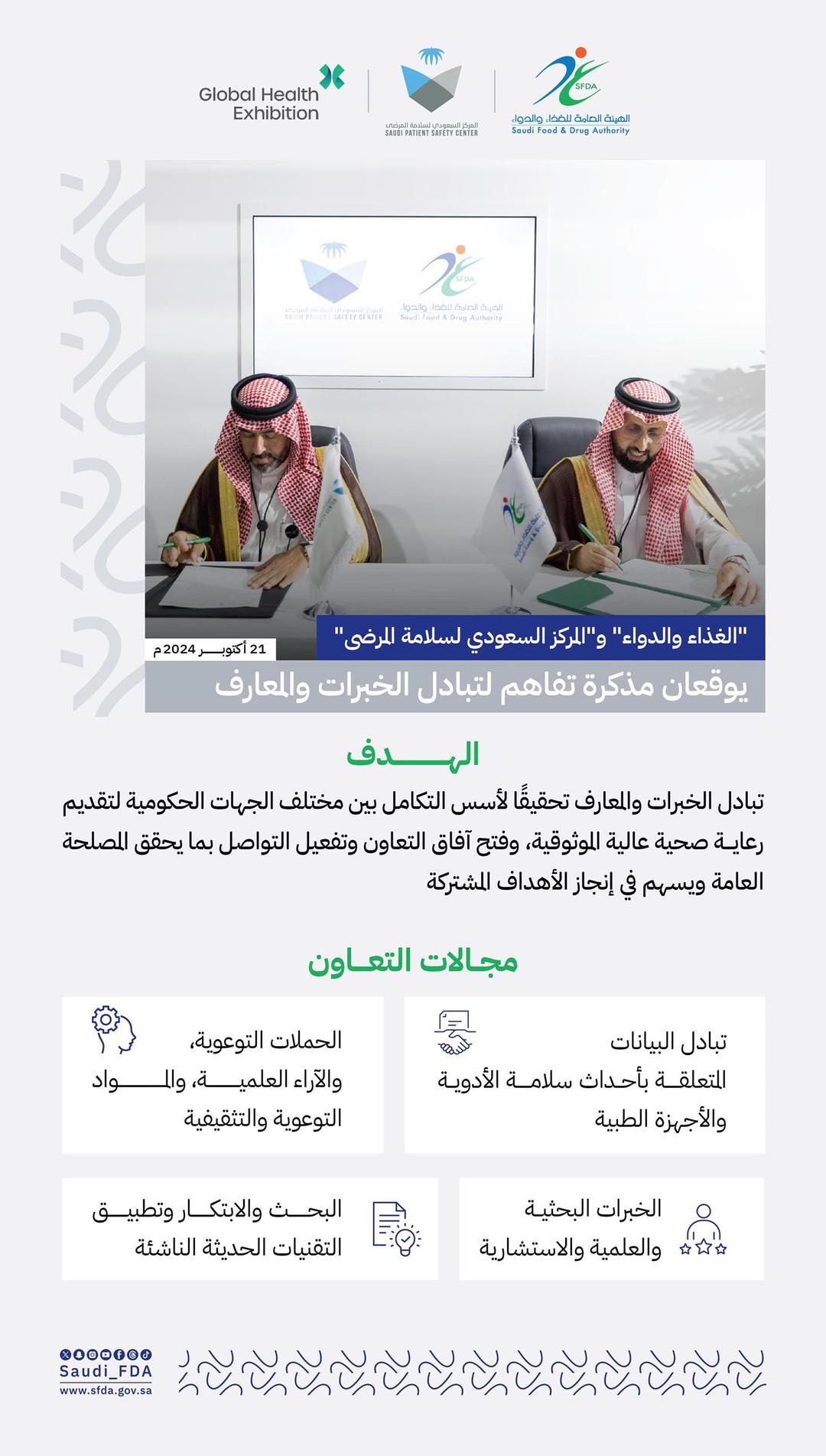 وقّعت الهيئة العامة للغذاء والدواء , اليوم ، مذكرة تفاهم مع المركز السعودي لسلامة المرضى , بهدف تبادل الخبرات والمعارف، وذلك على هامش ملتقى الصحة العالمي 2024م الذي يُعقد في مركز الرياض الدولي للمؤتمرات والمعارض.