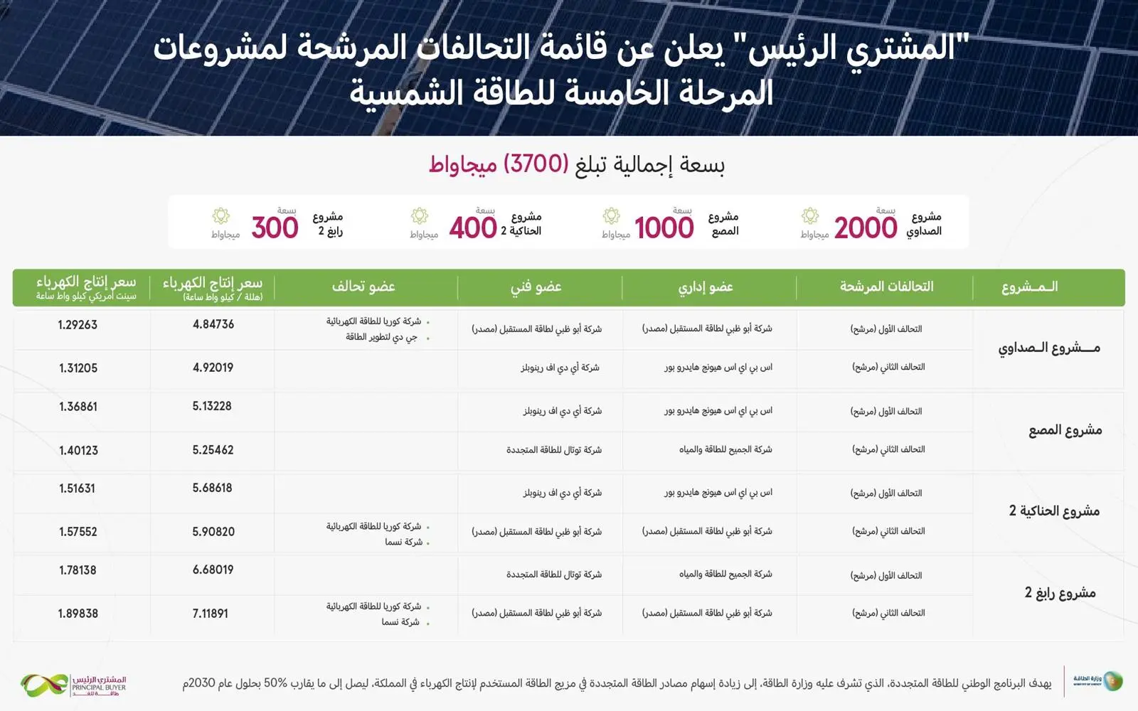 أعلنت الشركة السعودية لشراء الطاقة “المشتري الرئيس”، عن قائمة التحالفات المرشحة لأربعة مشروعاتٍ، ضمن مشروعات الطاقة الشمسية، للمرحلة الخامسة من البرنامج الوطني للطاقة المتجددة، الذي تشرف عليه وزارة الطاقة.