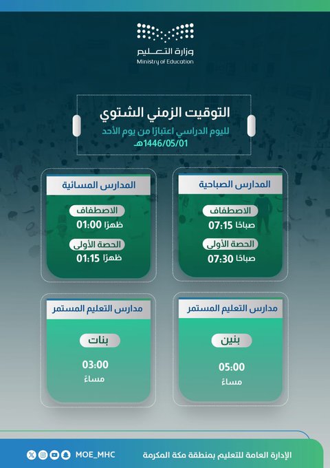 اعتمدت الإدارة العامة للتعليم بمنطقة مكة المكرمة مواعيد الدوام الشتوي للعام الدراسي الحالي، على أن يبدأ تطبيقه اعتبارًا من أول أيام شهر جمادى الأولى للعام الحالي.