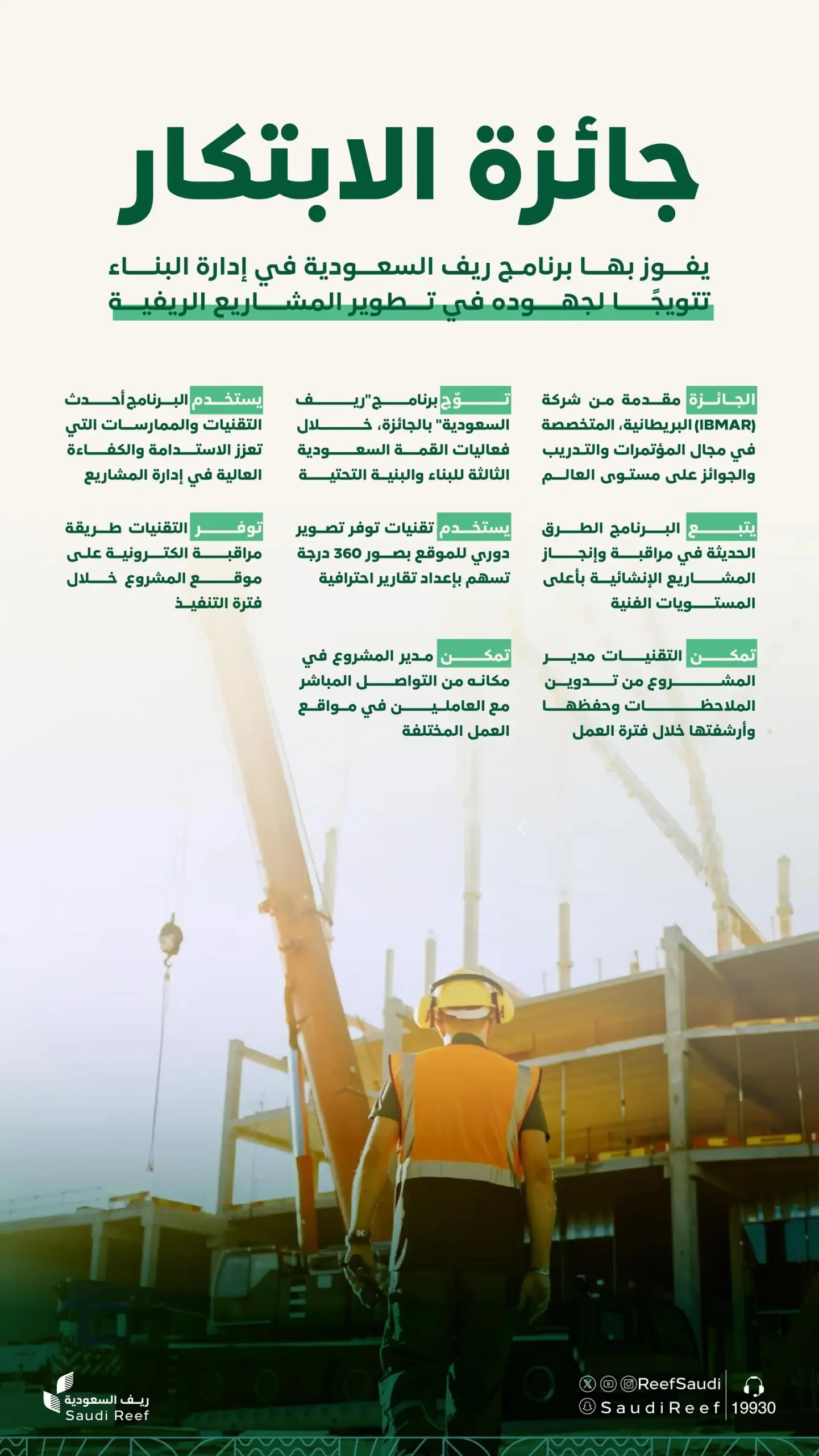 حصل برنامج التنمية الريفية الزراعية المستدامة “ريف السعودية”، على جائزة “الشراكة في مجال الابتكار في إدارة البناء”، التي تقدمها شركة (IBMAR) البريطانية، المتخصصة في مجال المؤتمرات والتدريب والجوائز على مستوى العالم.