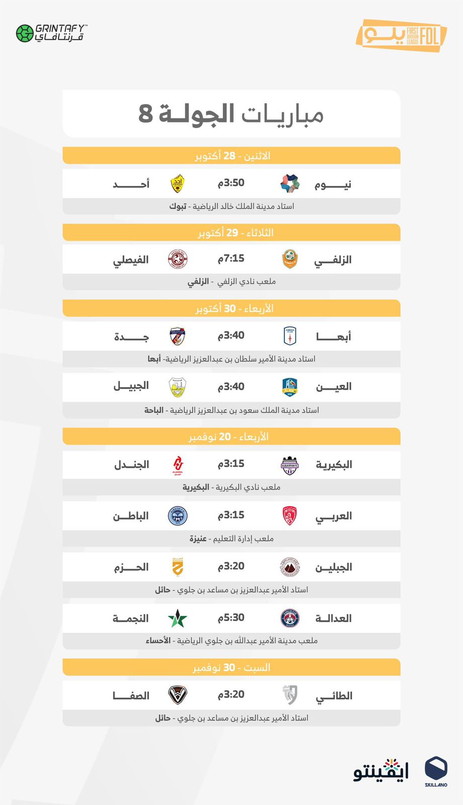 تنطلق غدًا منافسات الجولة الثامنة من دوري الدرجة الأولى للمحترفين، التي تشهد إقامة 4 مباريات في مواعيدها المقررة سلفًا بينما تم تأجيل 5 مباريات للشهر المقبل نظرًا لمشاركة أحد طرفيها في مباريات ثمن نهائي كأس خادم الحرمين الشريفين التي تتزامن مع مباريات الجولة.