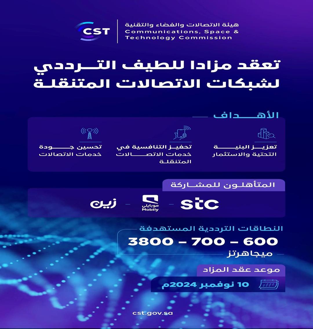 أعلنت هيئة الاتصالات والفضاء والتقنية عن عقد المزاد الخامس الخاص بالطيف الترددي في النطاقات (600، 700 ،3800) ميجاهرتز لشبكات الاتصالات المتنقلة في العاشر من نوفمبر المقبل، بهدف تعزيز البنية التحتية الرقمية وتحفيز الاستثمار والتنافسية في خدمات الاتصالات المتنقلة، ونشر شبكات اتصالات مبتكرة تتمتع بالجودة؛ تعزيزًا لريادة المملكة كمركز للابتكار والتقنية.