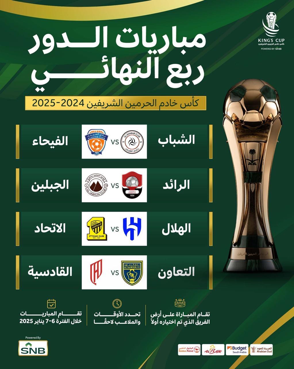 أجريت مساء اليوم مراسم قرعة الدور ربع النهائي من كأس خادم الحرمين الشريفين لموسم 2024-2025.