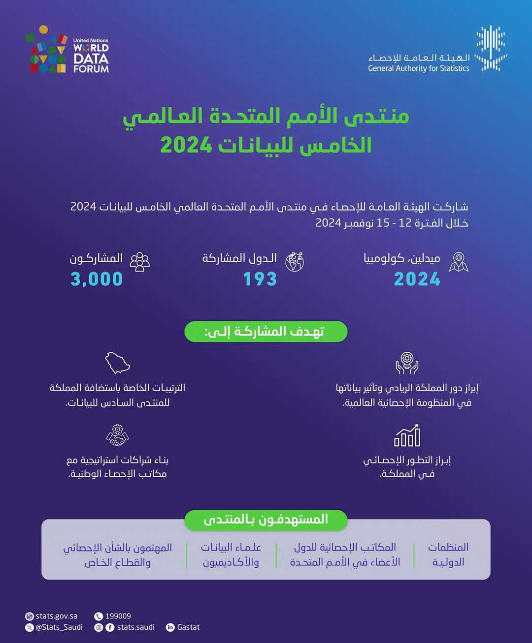 ويعد منتدى الأمم المتحدة العالمي للبيانات حدث عالمي يحضره أكثر من 20 ألف مشارك يمثلون الحكومات والمكاتب الإحصائية الوطنية، والمنظمات الدولية والإقليمية، والمجتمع المدني، والأوساط الأكاديمية، والقطاع الخاص، وذلك لمناقشة تحديات النظام العالمي للبيانات والإحصاءات وتعزيز التعاون بين قادة صانعي السياسات والخبراء من جميع أنحاء العالم، مما يعكس المستوى المتزايد من التعاون عبر نظم البيانات المتنوعة ويبرز الأهمية للبيانات والإحصاءات.