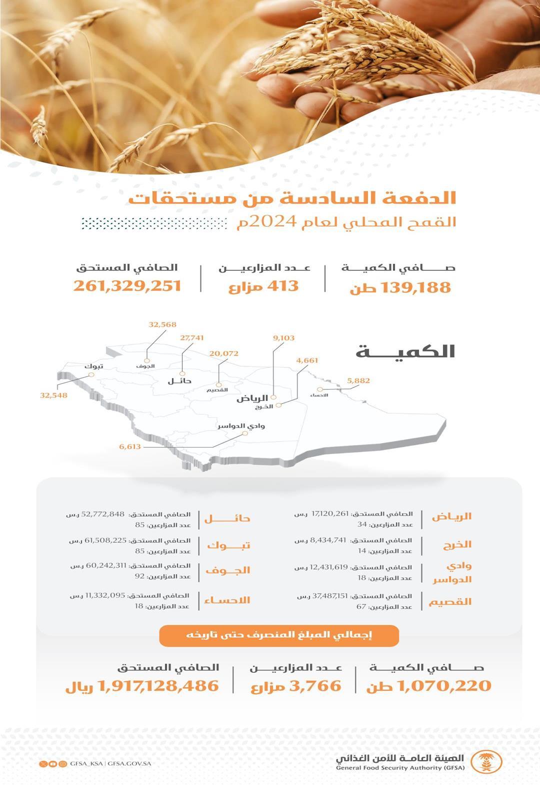 صرفت الهيئة العامة للأمن الغذائي، مستحقات الدفعة السادسة لمزارعي القمح المحلي، الذين قاموا بتوريد الكميات المخصصة لهم لهذا الموسم 1445/1446هـ (2024م)، وإغلاق حساباتهم عبر المنصة الإلكترونية “محصولي” على الموقع الرسمي للهيئة.