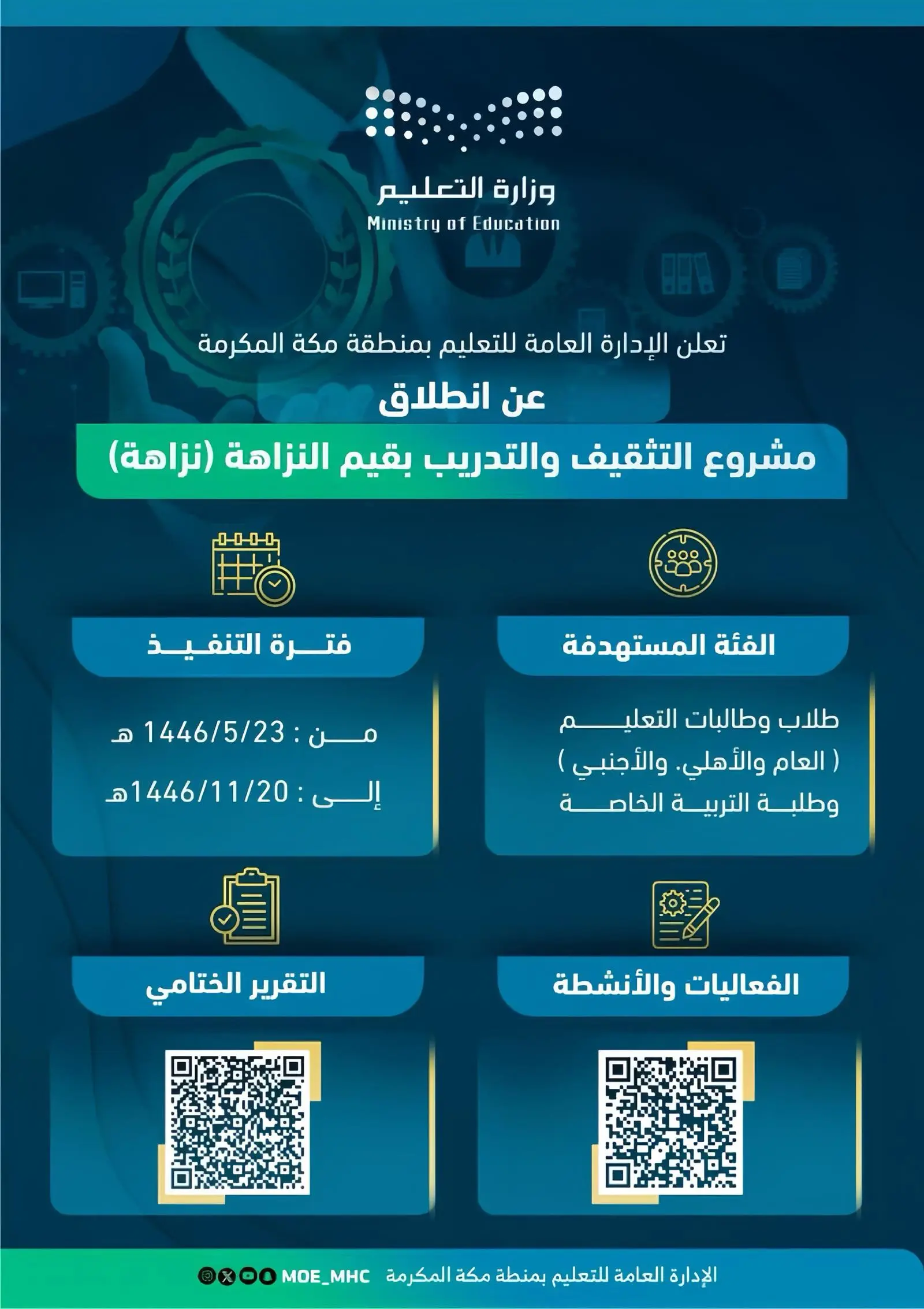 أعلنت الإدارة العامة للتعليم بمنطقة مكة المكرمة اليوم, عن إطلاق مشروع التثقيف والتدريب بقيم النزاهة “نزاهة”, الذي يهدف إلى بناء وتعزيز قيم النزاهة لدى طلاب وطالبات التعليم العام وذلك خلال الفترة من 23 / 5 إلى 20 / 11 / 1446هـ.