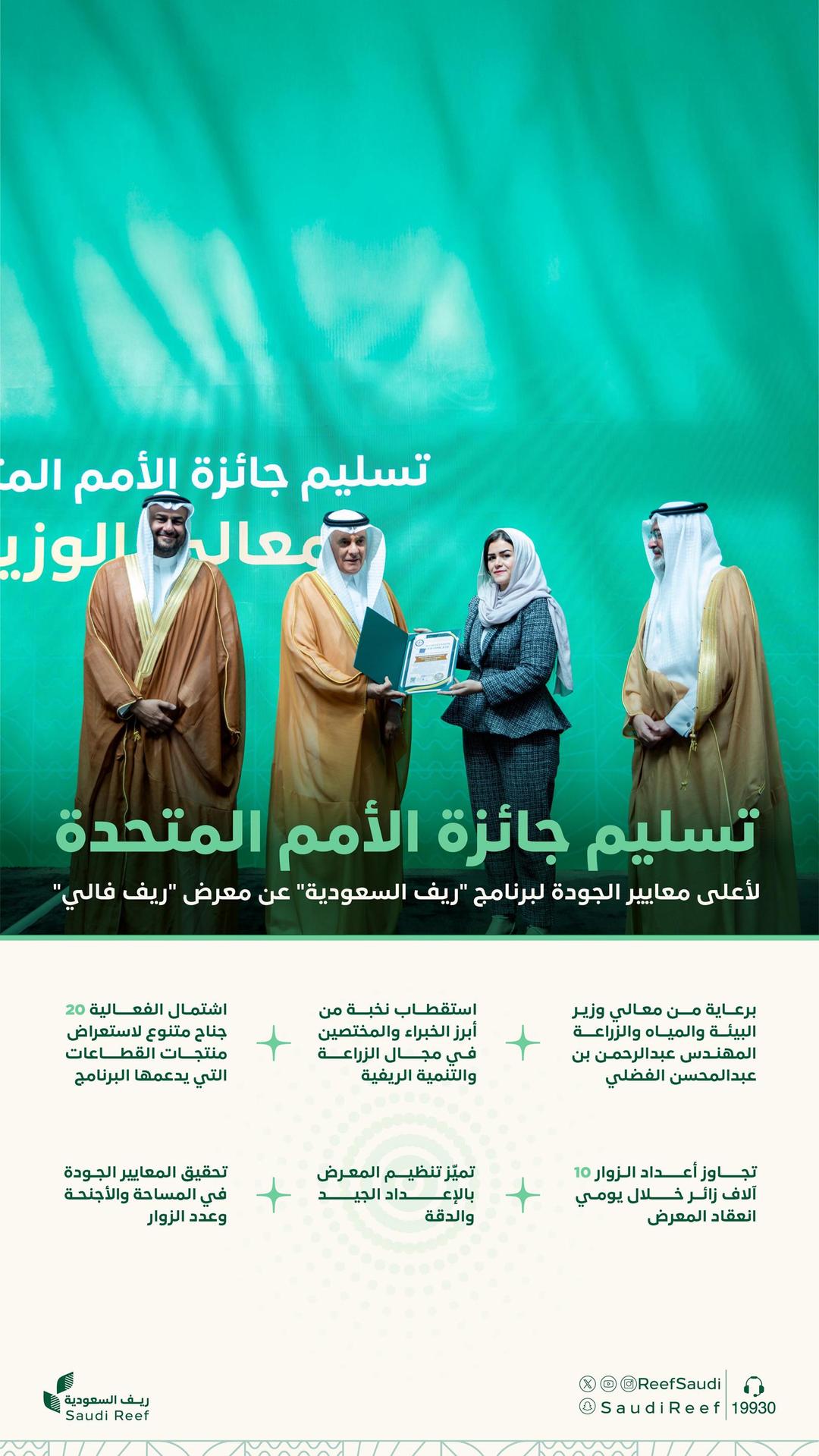 تسلّم معالي وزير البيئة والمياه والزراعة المهندس عبدالرحمن بن عبدالمحسن الفضلي، جائزة الأمم المتحدة لأعلى معايير الجودة، التي حصل عليها برنامج التنمية الريفية الزراعية المستدامة “ريف السعودية”، لتميزه، ونجاحه في تنظيم معرض “ريف فالي”، الذي أقيم بمحافظة الدرعية في سبتمبر الماضي، كما دشّن معاليه برنامج ريادة الأعمال لـبرنامج “ريف السعودية”.
