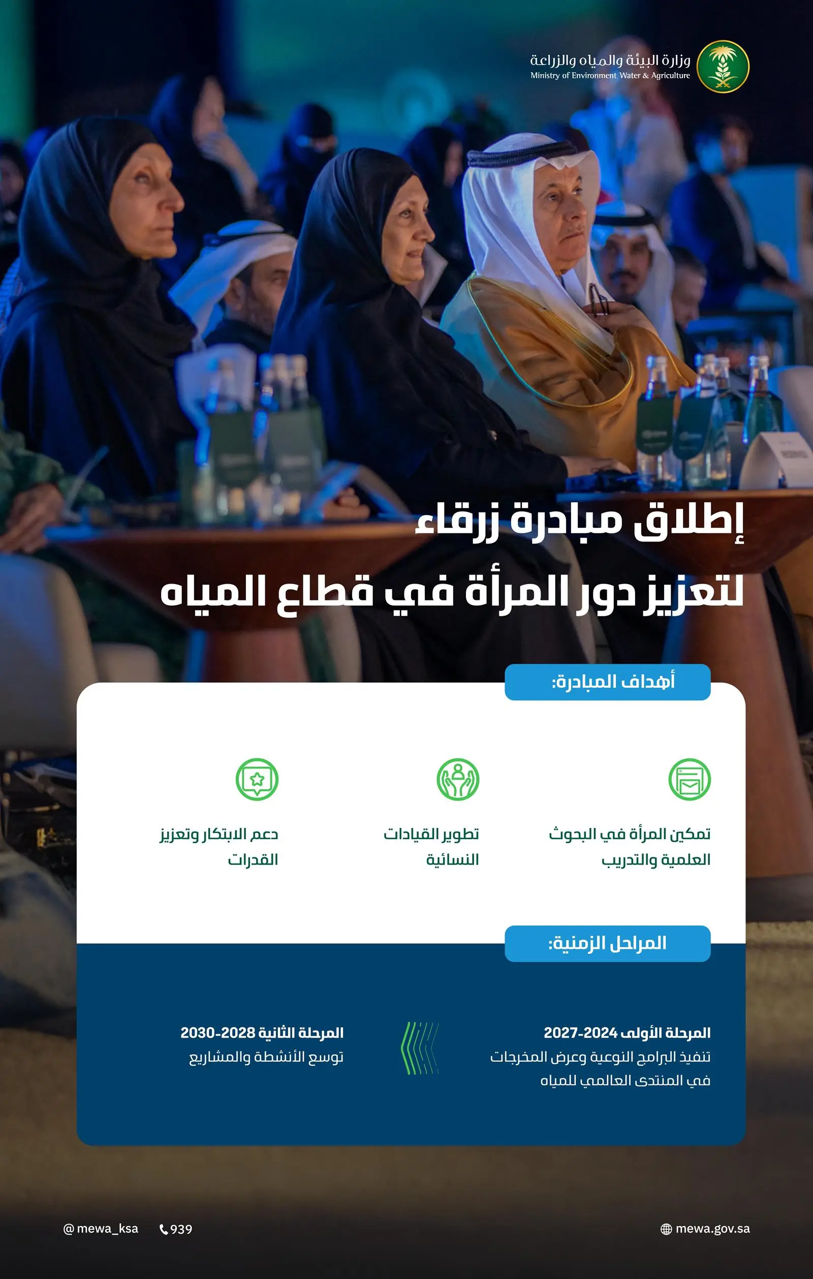 وأوضحت الوزارة أن المبادرة ستنفذ على مرحلتين، الأولى يتم تنفيذها خلال الفترة (2024-2027م) وسيتم خلالها تنفيذ البرامج النوعية وعرض المخرجات ضمن المنتدى العالمي للمياه، فيما تشهد المرحلة الثانية، خلال الفترة (2028- 2030م) توسيع الأنشطة والمشاريع لتعزيز الأثر الإيجابي للمبادرة، وتفعيل دور المرأة في قطاع المياه من خلال عدة محاور، تشمل البحث العلمي، التدريب، ورش العمل، تطوير القيادات، وتنظيم المسابقات، إضافة إلى تكريم النماذج النسائية الملهمة، بما يعزز من إسهام المرأة في هذا القطاع الحيوي ويحقق أثرًا مستدامًا للمبادرة.