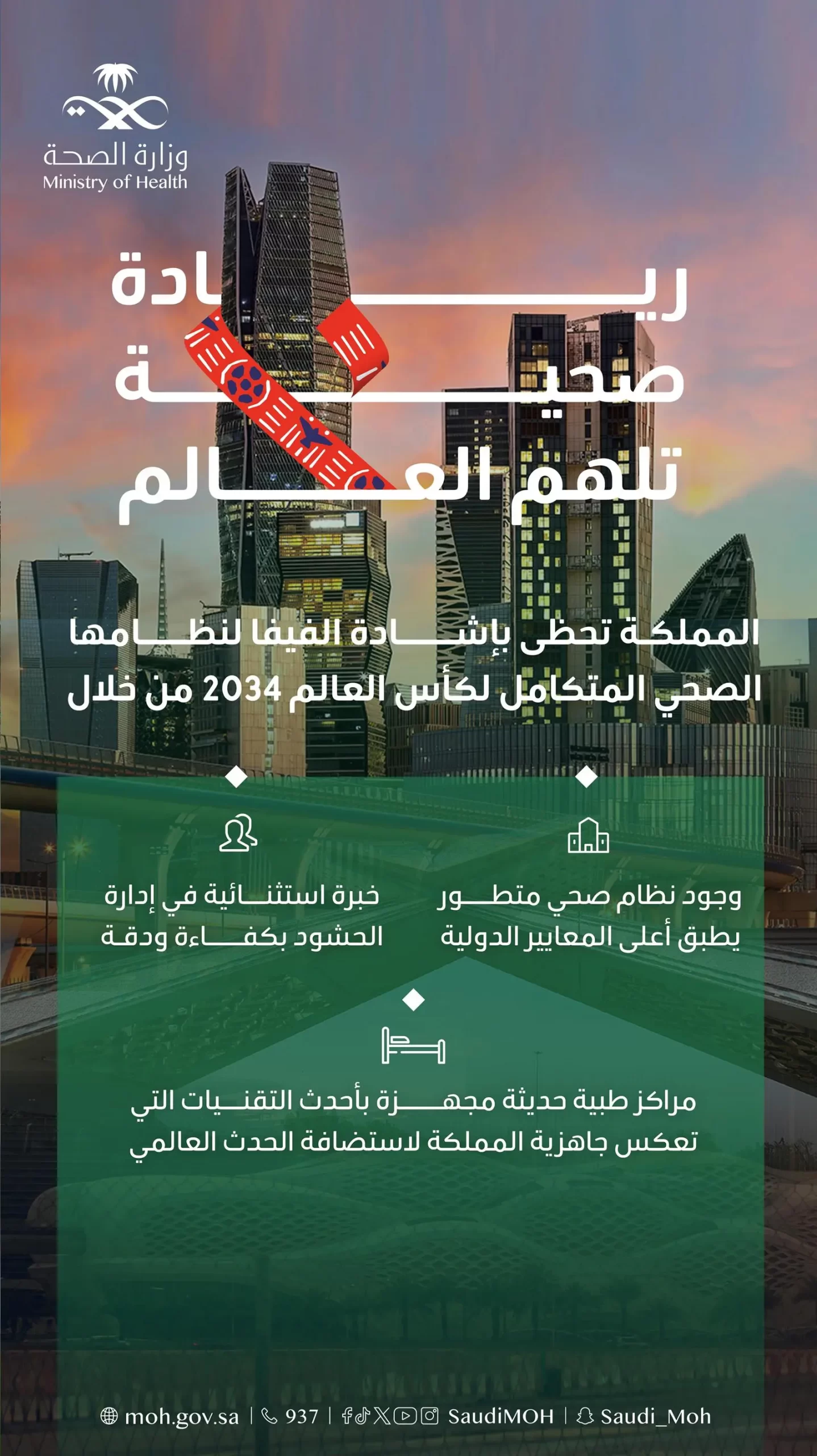 ويعكس ملف ترشح السعودية لاستضافة كأس العالم 2034 الالتزام الكامل بأولوية صحة الإنسان، وجاهزية النظام الصحي لاستضافة هذا الحدث الرياضي العالمي بكفاءة عالية، ما يضمن تجربة رياضية وصحية آمنة لجميع المشاركين والجماهير.