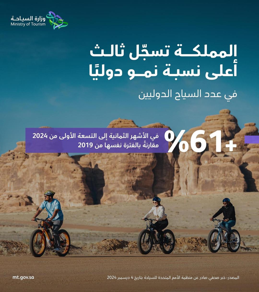 واصلت المملكة العربية السعودية تسجيل أرقام مميّزة في أعداد السياح الدوليين خلال العام الحالي 2024م، حيث احتلت المركز الثالث عالميًا في أعلى نسبة نمو لأعداد السياح الدوليين في الأشهر الثمانية إلى التسعة الأولى من العام الجاري، بنسبة نمو بلغت 61% مقارنةً بالفترة المماثلة من عام 2019م، وفقًا لخبر صادر عن منظمة الأمم المتحدة للسياحة في شهر ديسمبر 2024م.