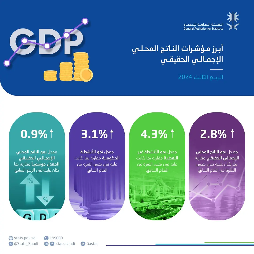 أصدرت الهيئة العامة للإحصاء اليوم، الناتج المحلي الإجمالي، ومؤشرات الحسابات القومية للربع الثالث من عام 2024م، حيث حقق الناتج المحلي الإجمالي الحقيقي خلال الربع الثالث من عام 2024م نموًا بنسبة 2.8% مقارنةً بما كان عليه في نفس الفترة من العام السابق، مدعومًا بنمو الأنشطة غير النفطية بنسبة 4.3% مقارنةً بما كانت عليه في نفس الفترة من العام السابق.