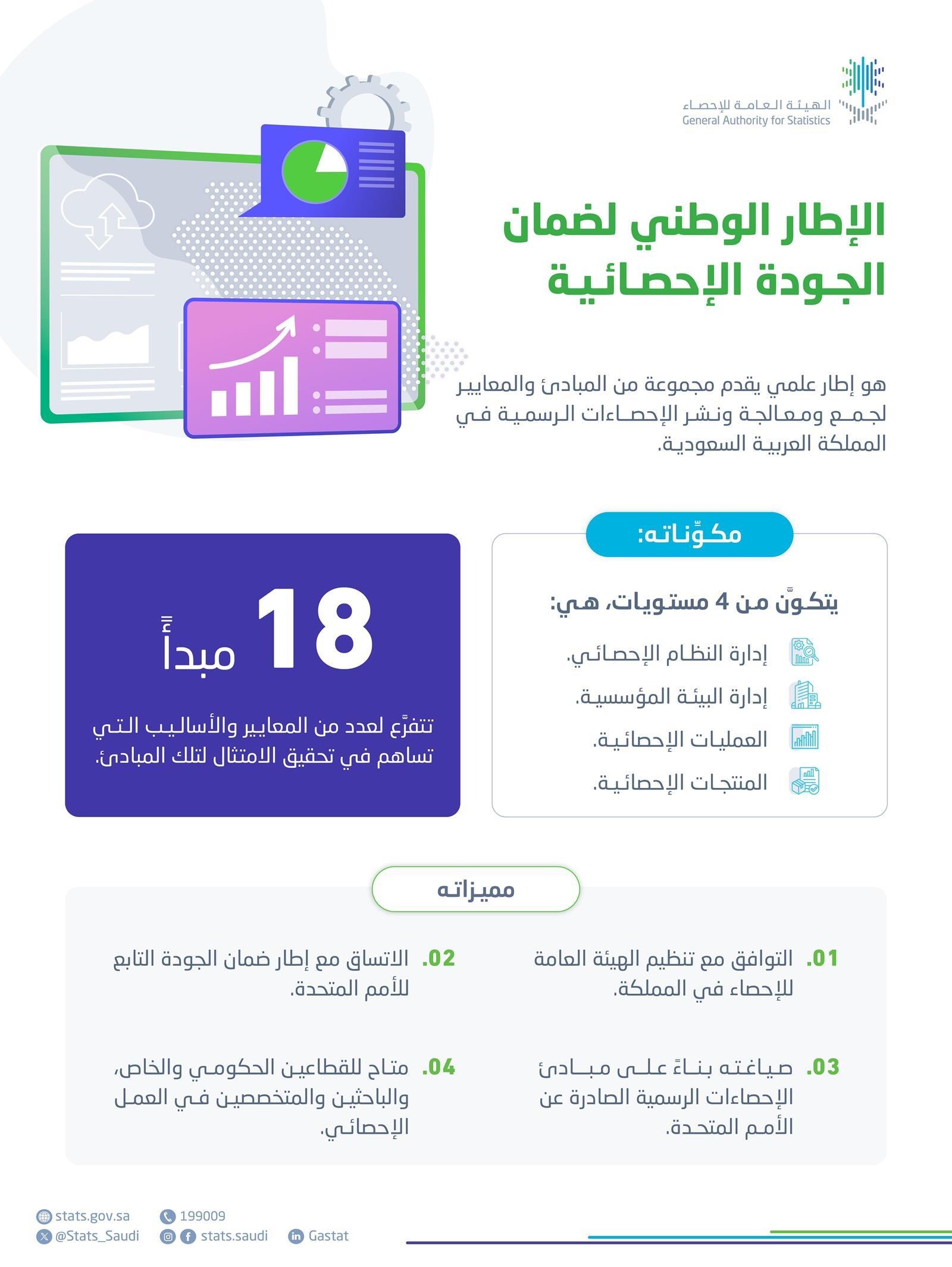 أصدرت الهيئة العامة للإحصاء إطار ضمان الجودة الإحصائية، الذي يقدم مبادئ ومعايير لجمع ومعالجة ونشر الإحصاءات الرسمية في المملكة العربية السعودية، واُعتمدت مواد الإطار بناءً على المبادئ الأساسية للإحصاءات الرسمية الصادرة عن الأمم المتحدة، واتساقه مع إطار ضمان الجودة التابع للأمم المتحدة، بالإضافة إلى مراعاة تنظيم الهيئة العامة للإحصاء في المملكة العربية السعودية.