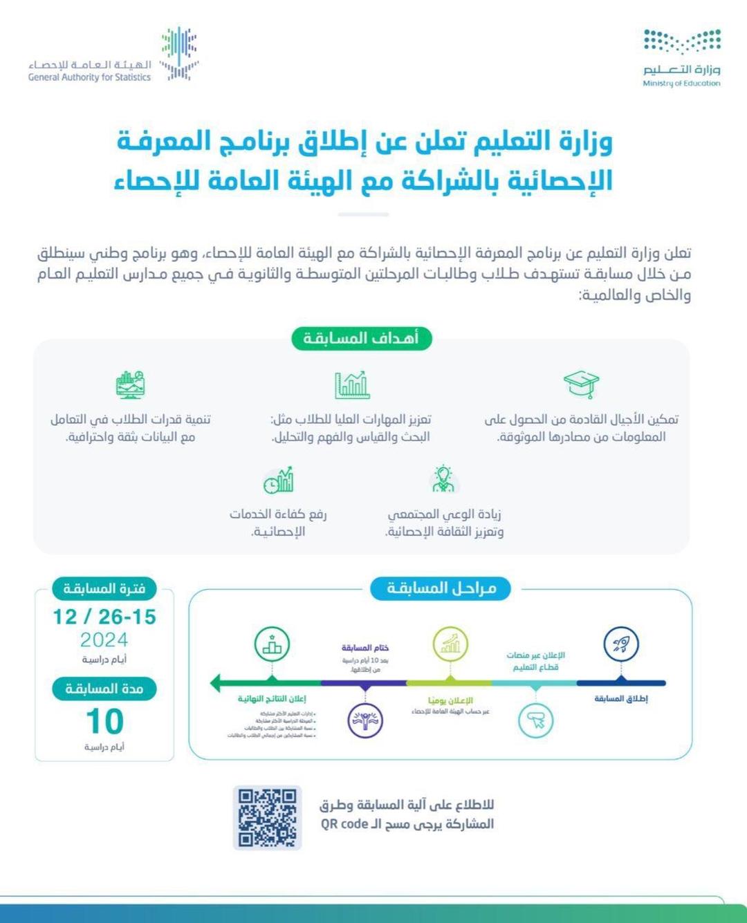 دعت الإدارة العامة للتعليم بمنطقة مكة المكرمة طلبة المرحلتين المتوسطة والثانوية بمدارس التعليم العام والخاص والأجنبي، للمشاركة في مسابقة برنامج المعرفة الإحصائية الذي أطلقته وزارة التعليم بالشراكة مع الهيئة العامة للإحصاء، لتعزيز الوعي المجتمعي بالثقافة الإحصائية خلال الفترة من 15 إلى 26 ديسمبر 2024 .