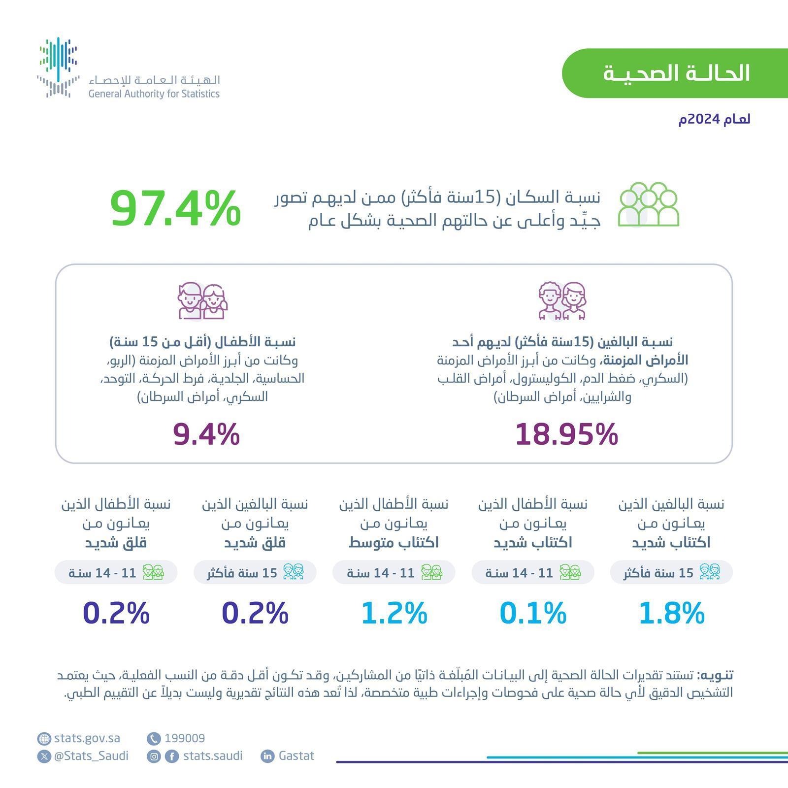 يذكر أن نشرة إحصاءات الحالة الصحية للبالغين والأطفال تستعرض المؤشرات بناءً على الإبلاغ الذاتي للأفراد من نتائج المسح الصحي الوطني، ومسح صحة المرأة والطفل لعام 2024م، وتقديرات السكان من الهيئة العامة للإحصاء لعام 2024م.