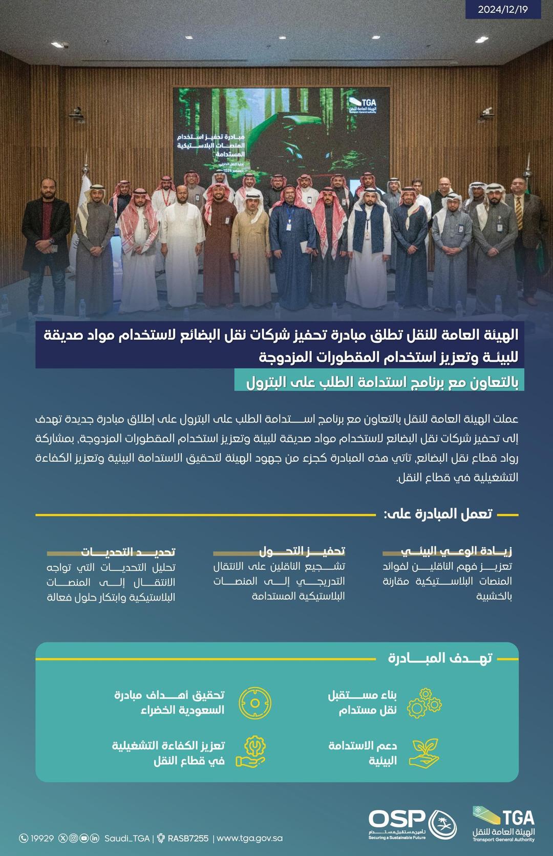 أطلقت الهيئة العامة للنقل بالتعاون مع برنامج استدامة الطلب على البترول مبادرة تحفيز شركات نقل البضائع لاستخدام مواد صديقة للبيئة وتعزيز استخدام المقطورات المزدوجة حرصًا على تعزيز التعاون بين الجهات الحكومية والقطاع الخاص في مجال النقل والخدمات اللوجستية بما يحقق كفاءة عمليات النقل، ولأهمية النقل المستدام والآمن.