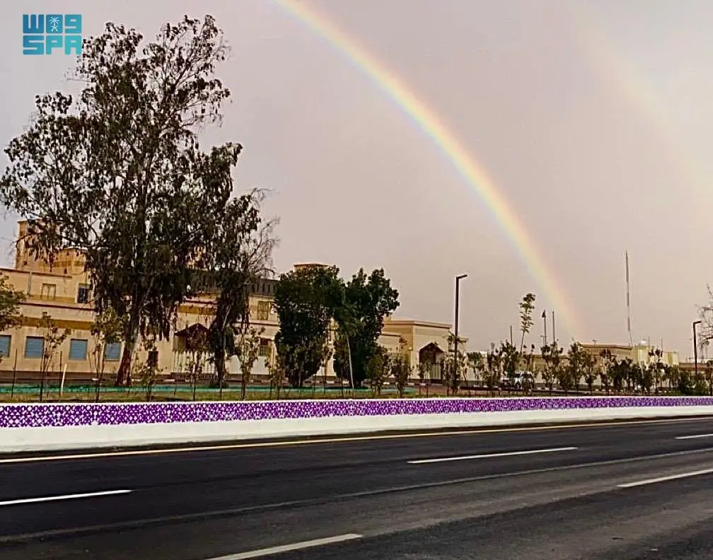 ارتسمت ألوان الطيف الزاهية في سماء محافظة رفحاء، بمنطقة الحدود الشمالية ، بعد أن شهدت المحافظة هطول أمطار خفيفة اليوم.