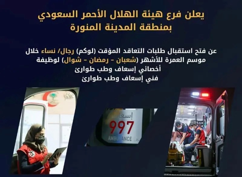أعلن فرع هيئة الهلال الأحمر بمنطقة المدينة المنورة فتح استقبال طلبات التعاقد المؤقت “لوكم” رجال / نساء خلال موسم العمرة للأشهر (شعبان – رمضان – شوال)، لوظيفة أخصائي إسعاف، وطب طوارئ، وفني إسعاف.