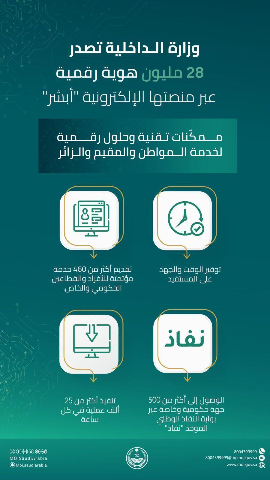 آخر الأخبار > عبر منصّتها الإلكترونية “أبشر”.. وزارة الداخلية تعلن تجاوز الهويات الرقمية 28 مليونًا