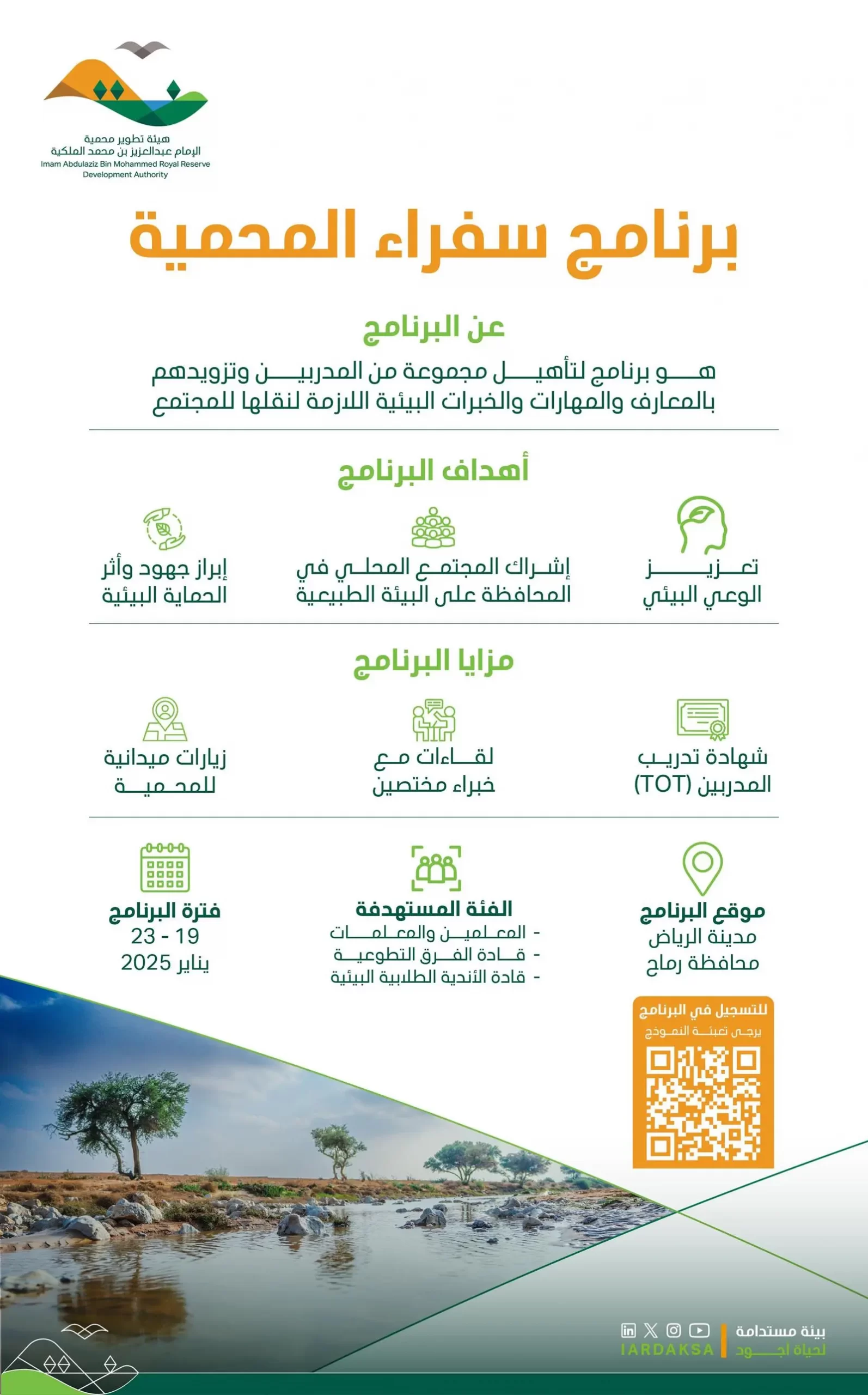 أعلنت هيئة تطوير محمية الإمام عبدالعزيز بن محمد الملكية عن إطلاق برنامج “سفراء المحمية”، الذي يُعد مبادرة جديدة تهدف إلى تأهيل مجموعة من المدربين المتخصصين في المجال البيئي، وتزويدهم بالمعارف والمهارات والخبرات اللازمة لتعزيز الوعي البيئي لدى المجتمع.