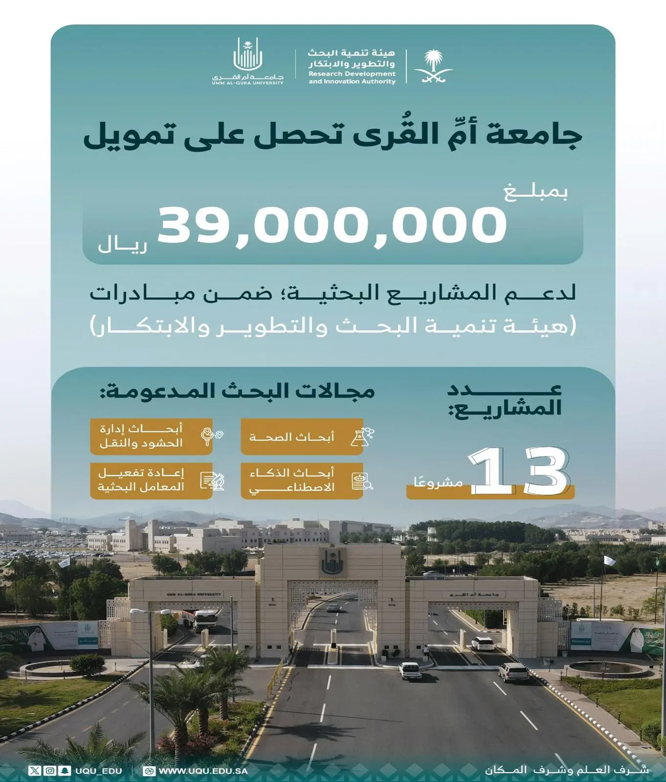 أطلقت جامعة أم القرى ١٣ مشروعًا بحثيًا بالشراكة مع هيئة تنمية البحث والتطوير والابتكار شملت المجال الصحي وأبحاث الذكاء الصناعي وأبحاث إدارة الحشود والنقل وإعادة تفعيل المعامل البحثية.