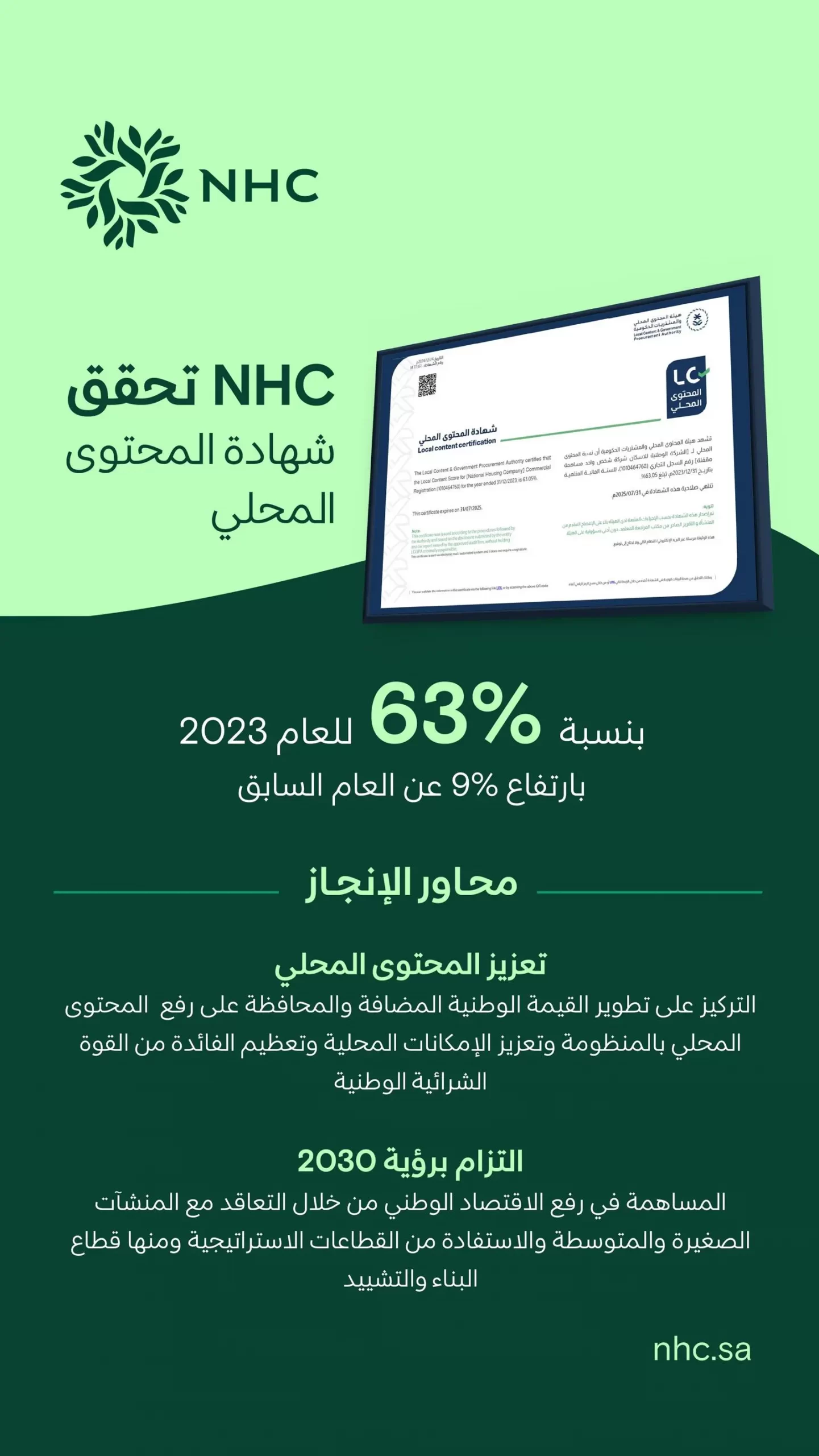 “NHC” تحقق شهادة المحتوى المحلي لعام 2023 بنسبة 63%