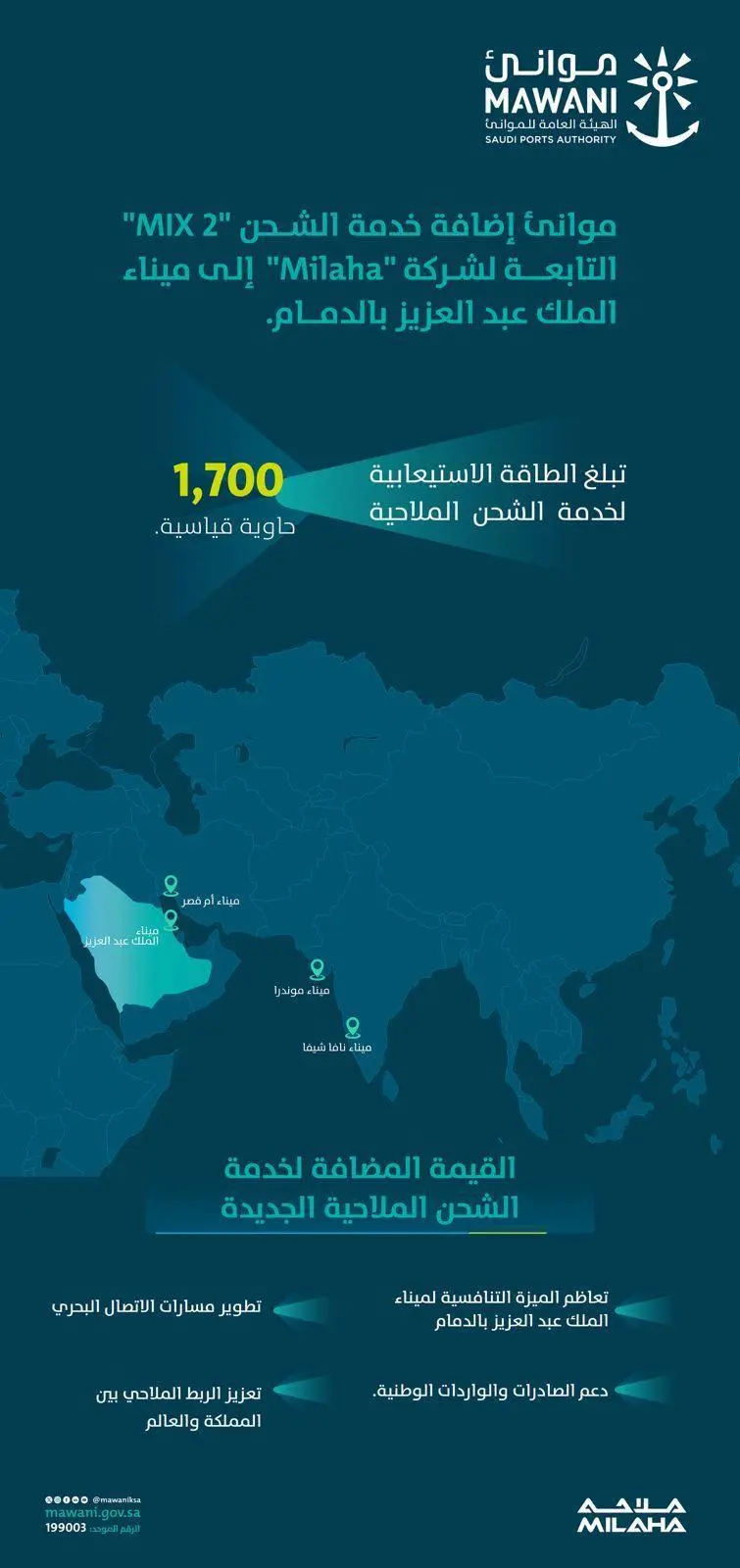 "موانئ": إضافة خدمة الشحن "mix 2" التابعة لشركة "milaha" إلى ميناء الملك عبدالعزيز بالدمام, موانئ