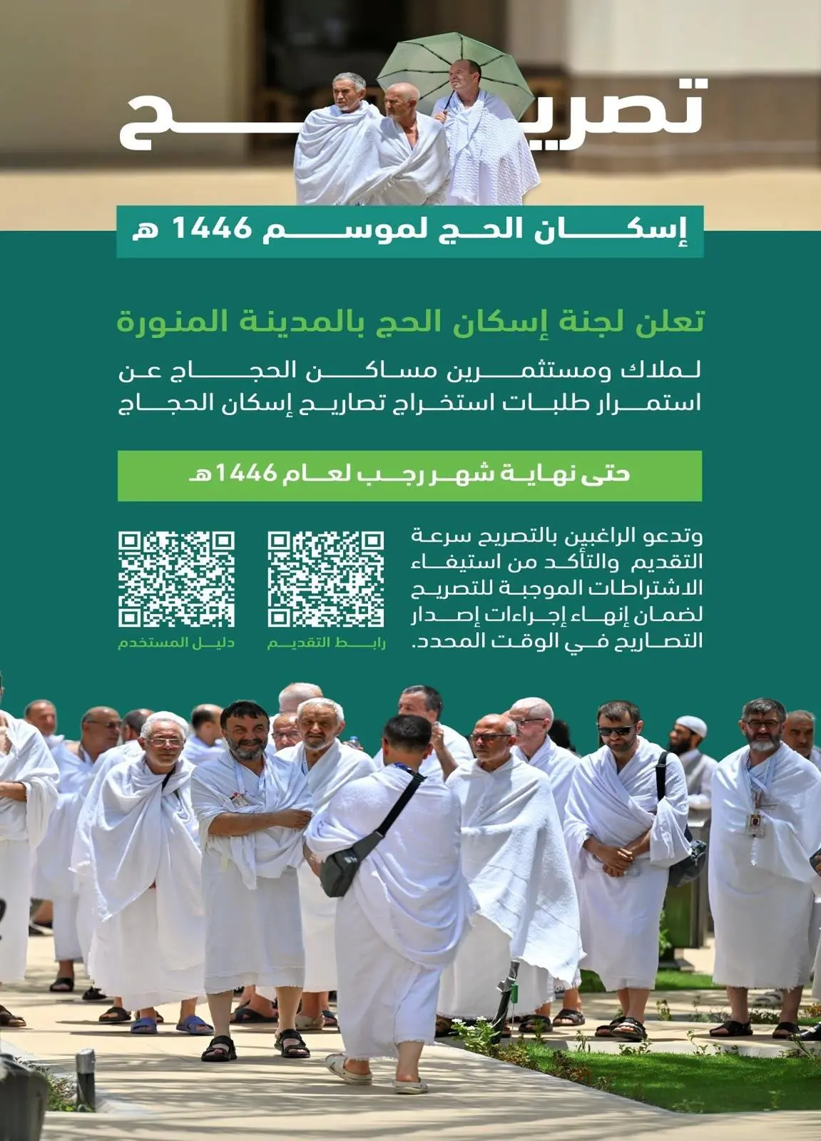 تواصل لجنة إسكان الحجاج بالمدينة المنورة، استقبال طلبات إصدار تصاريح إسكان الحجاج لموسم حج 1446هـ حتى نهاية شهر رجب الجاري.