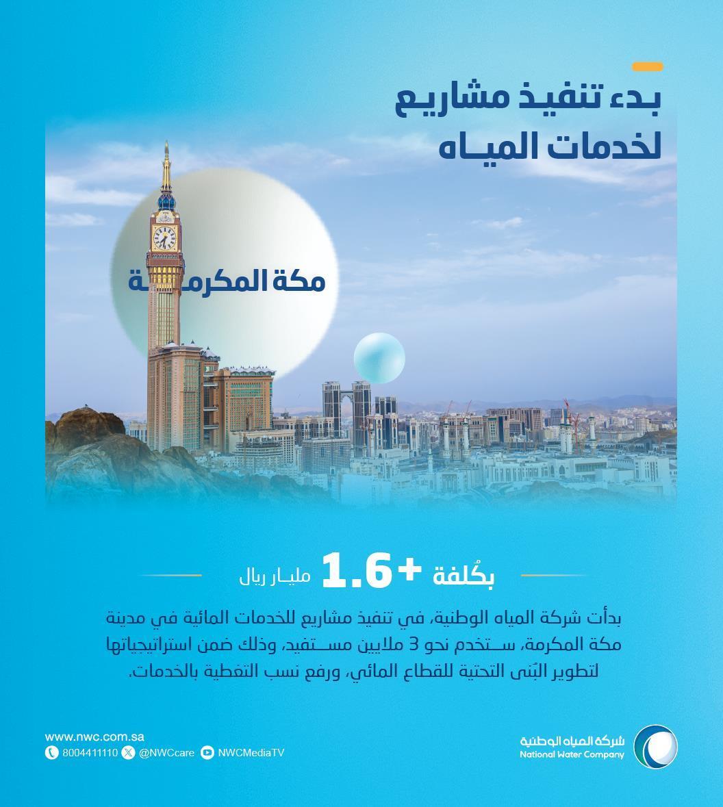 أعلنت شركة المياه الوطنية، ممثلة بالقطاع الغربي عن بدءها تنفيذ مشروعات للخدمات المائية في مدينة مكة المكرمة بكُلفة تجاوزت (1.6) مليار ريال، وذلك ضمن إستراتيجياتها لتطوير البُنى التحتية للقطاعين المائي والبيئي، ورفع نسب التغطية في المدن والمحافظات.