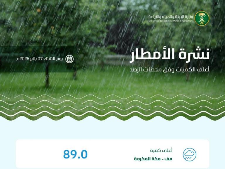 ووفقًا للتقرير اليومي الصادر عن وزارة البيئة والمياه والزراعة حول كميات هطول الأمطار في مناطق المملكة كافة؛ فقد سجّلت (136) محطة رصد هيدرولوجي ومناخي، خلال الفترة من الساعة التاسعة صباح الاثنين 6 يناير وحتى التاسعة صباح الثلاثاء 7 يناير 2025م، هطول أمطارٍ في مناطق (الرياض، مكة المكرمة، المدينة المنورة، القصيم، الشرقية، حائل، الحدود الشمالية، الباحة، والجوف).