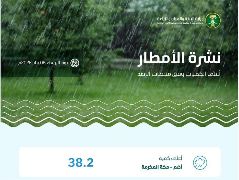 ووفقًا للتقرير اليومي لوزارة البيئة والمياه والزراعة حول كميات هطول الأمطار في مناطق المملكة كافة؛ سجّلت (46) محطة رصد هيدرولوجي ومناخي، خلال الفترة من الساعة التاسعة صباح الثلاثاء 7يناير وحتى التاسعة صباح الأربعاء 8 يناير 2025م؛ هطول أمطارٍ في مناطق (الرياض، مكة المكرمة، المدينة المنورة، الشرقية، عسير، الحدود الشمالية، والباحة).