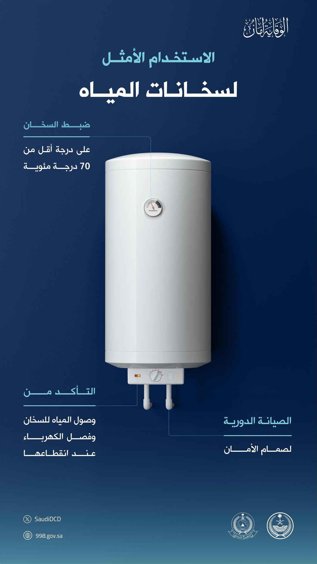 وأكدت أهمية ضبط السخانات على درجة حرارة أقل من 70 درجة مئوية، والصيانة الدورية لصمام الأمان، ووصول المياه، وفصل الكهرباء عنها عند انقطاعها.