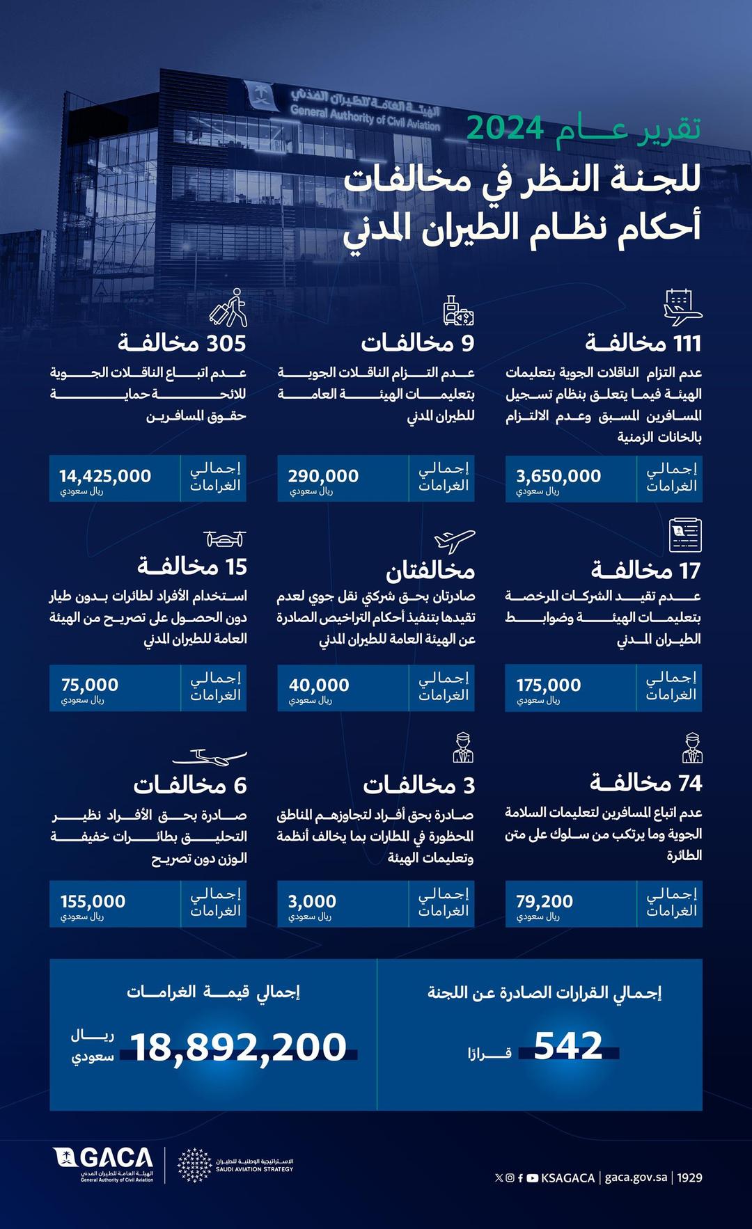 فرضت الهيئة العامة للطيران المدني مُمثلةً باللجنة المعنية بالنظر في مخالفات أحكام نظام الطيران المدني، (542) مخالفة خلال عام 2024م، شملت فرض غرامات مالية بلغت قيمتها (18.892.200) ريال على الكيانات والأفراد المخالفين لنظام الطيران المدني واللوائح التنفيذية والتعليمات الصادرة عن الهيئة.