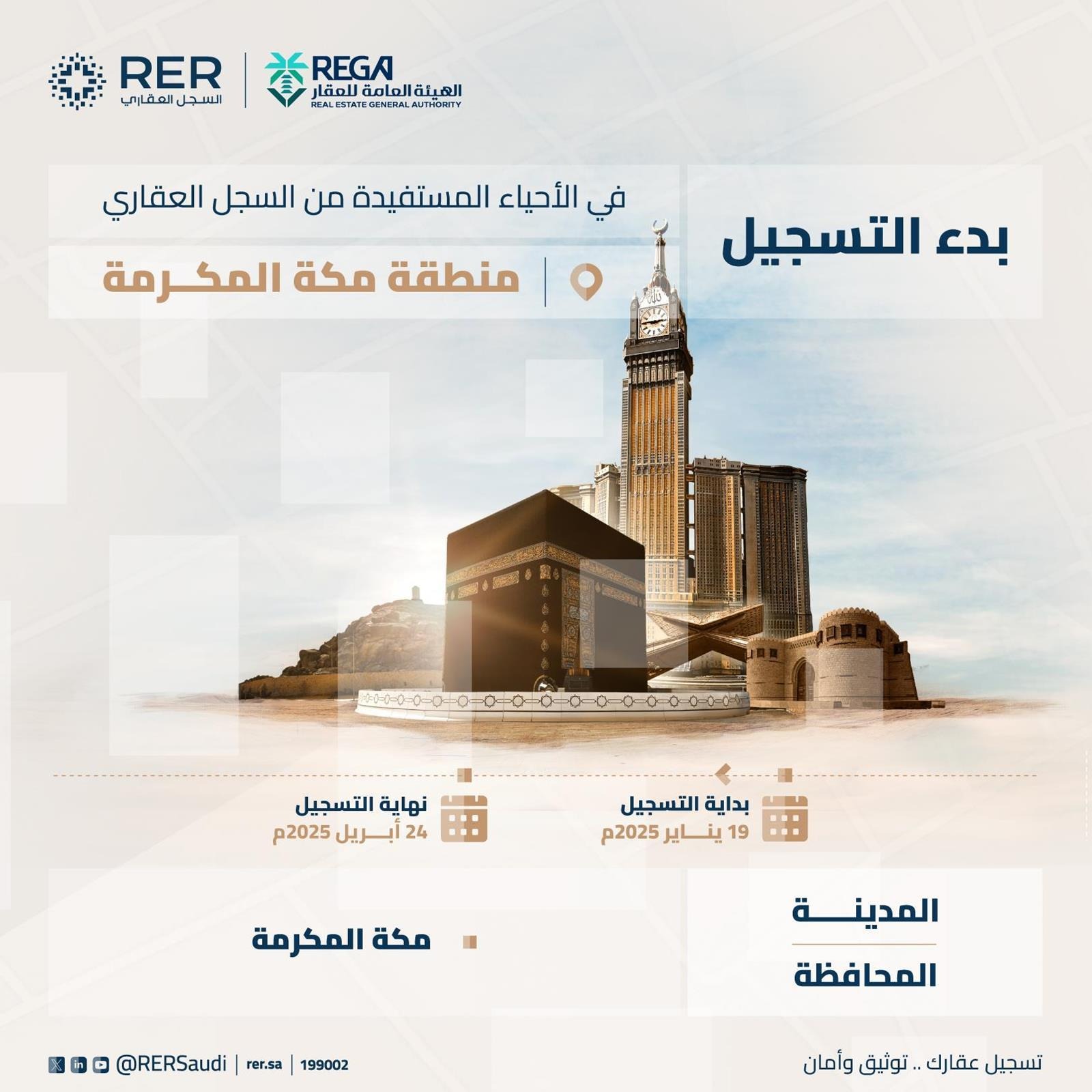 بدء السجل العقاري اليوم، في استقبال طلبات التسجيل العيني الأول لـ (19.239) قطعة عقارية في (28) حيًا في منطقة مكة المكرمة.