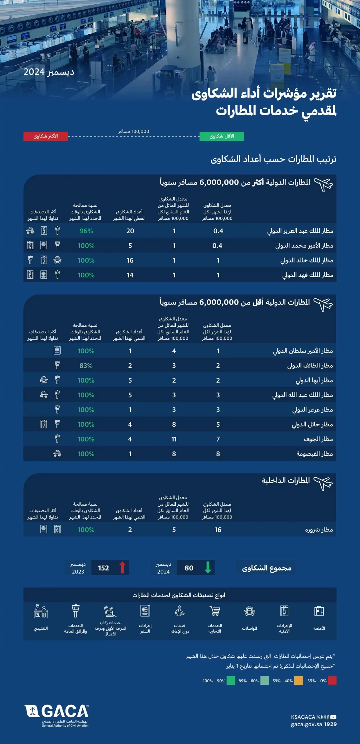 أصدرت الهيئة العامة للطيران المدني اليوم, مؤشر تصنيف مقدمي خدمات النقل الجوي والمطارات، من واقع عدد الشكاوى المرفوعة من المسافرين للهيئة خلال شهر ديسمبر 2024.