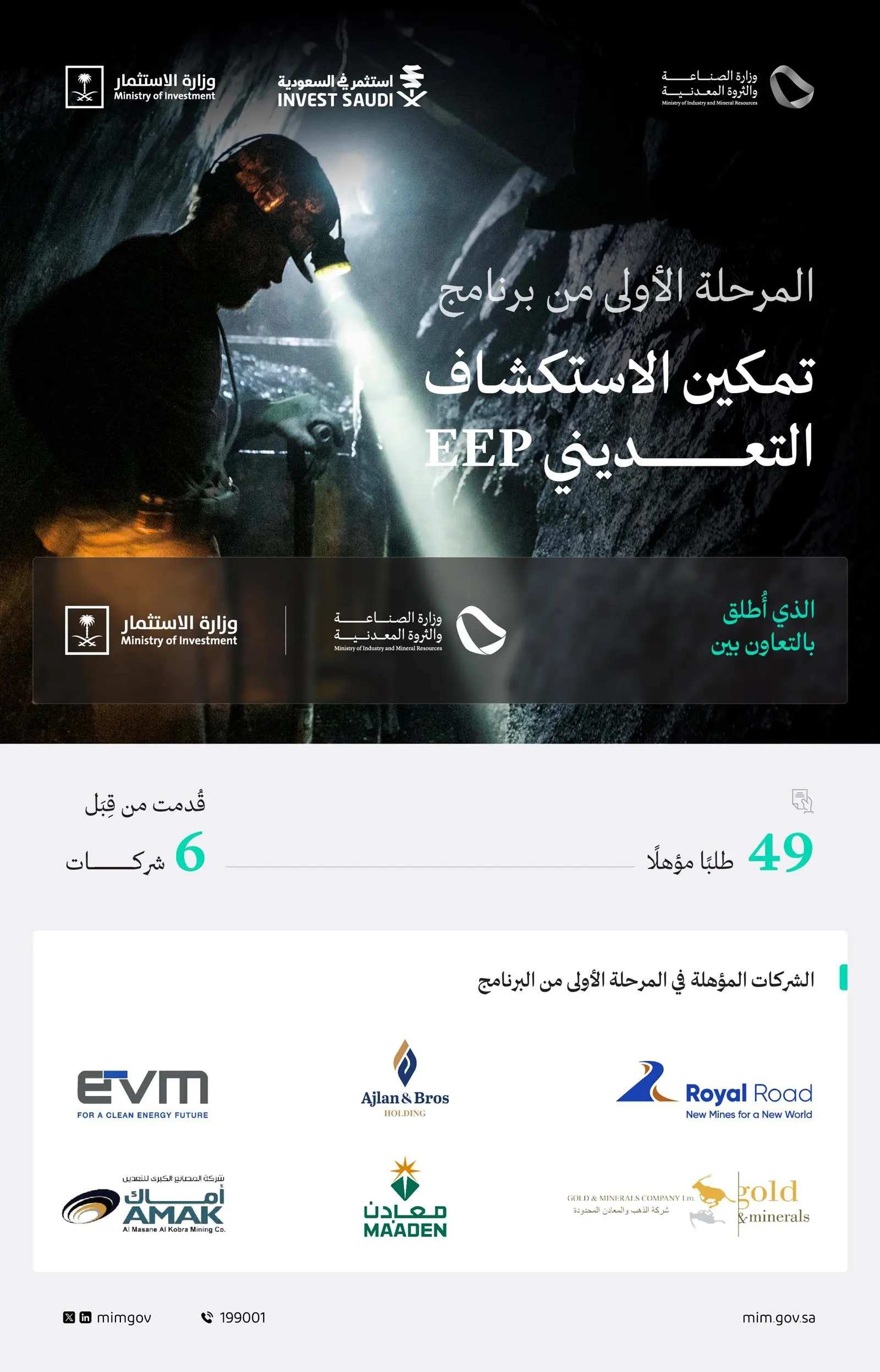 أعلنت وزارة الصناعة والثروة المعدنية ووزارة الاستثمار، عن تأهيل 6 شركات تعدينية محلية وعالمية، ضمن المرحلة الأولى من برنامج تمكين الاستكشاف التعديني، الذي يستهدف تمكين الاستثمارات النوعية في قطاع التعدين وتعزيز تنافسيته وجاذبيته، مع تسريع عمليات الاستكشاف التعديني.
