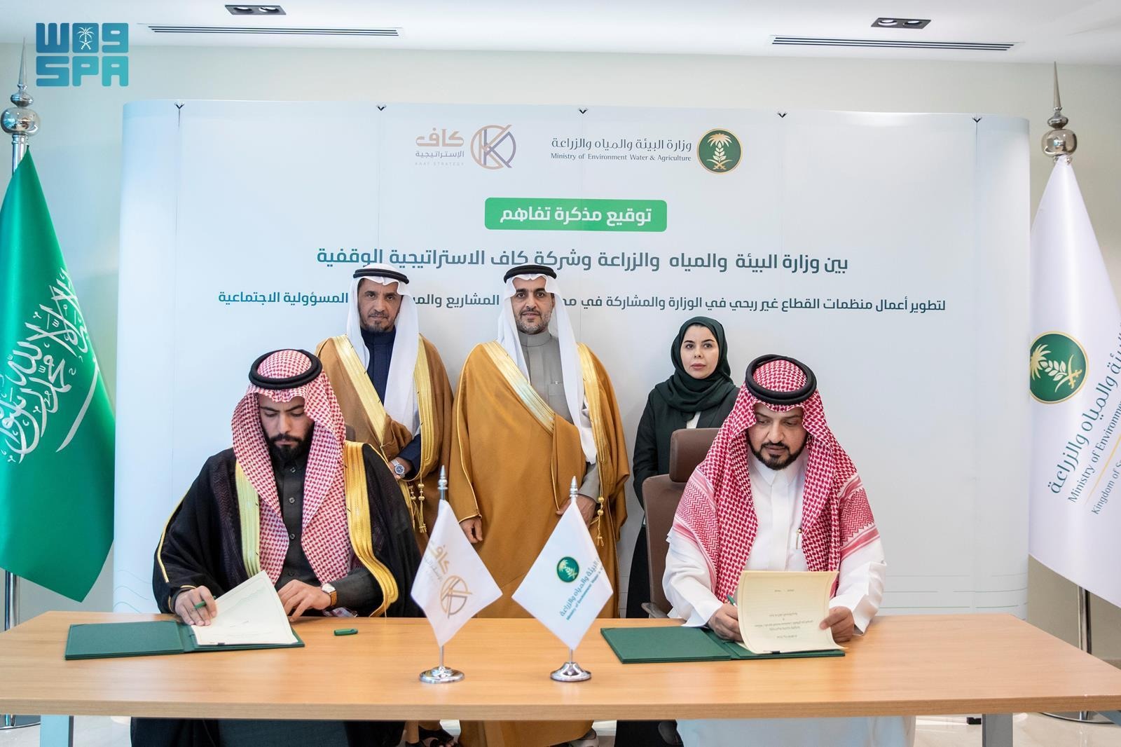 شهد معالي نائب وزير البيئة والمياه والزراعة المهندس منصور بن هلال المشيطي، توقيع مذكرتي تفاهم بين الوزارة، وكل من، مؤسسة الملك عبدالله بن عبدالعزيز لوالديه للإسكان التنموي، وشركة كاف الإستراتيجية الوقفية، بحضور وكيل الوزارة لخدمة المستفيدين وشؤون الفروع المهندس غانم الجدعان.