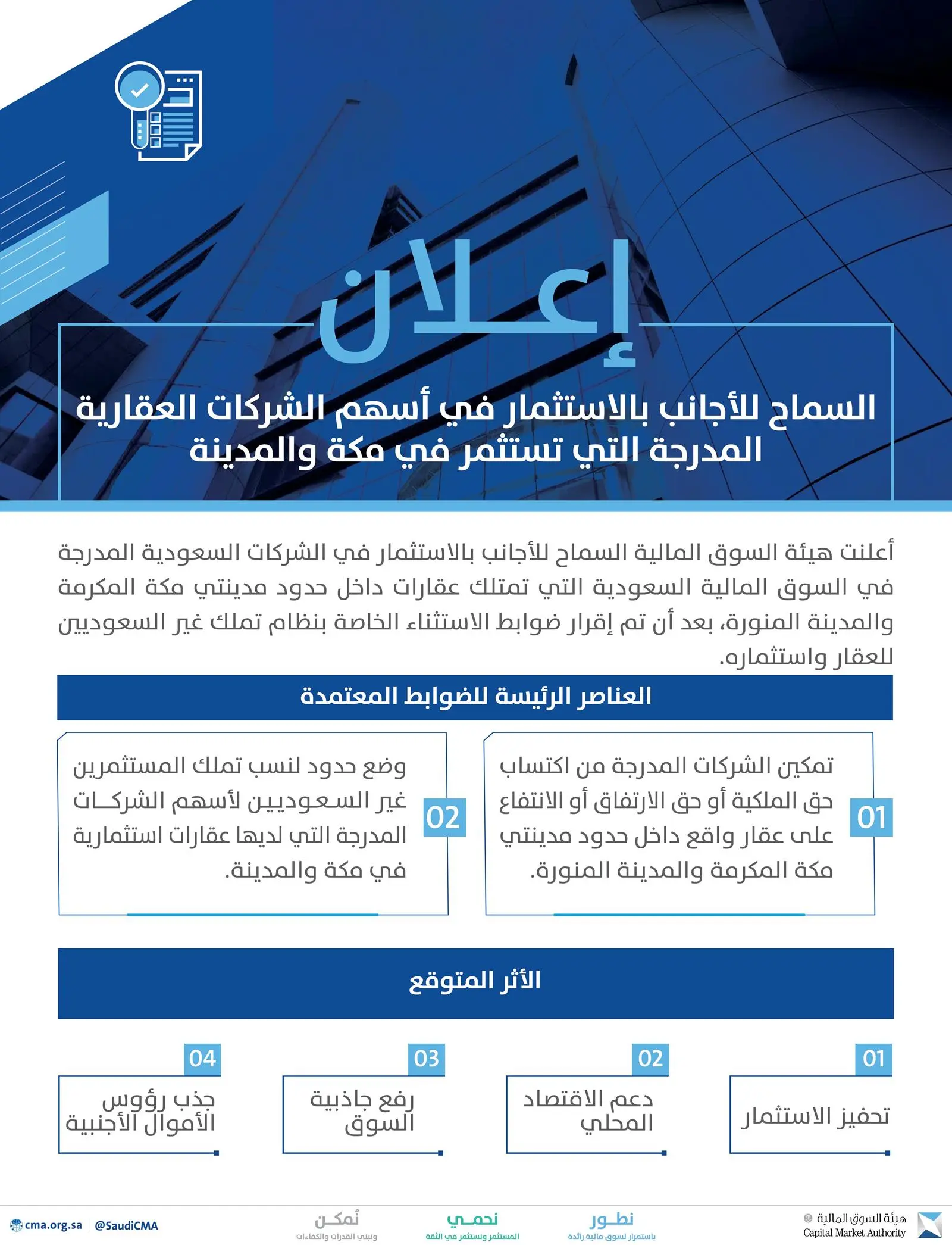 أعلنت هيئة السوق المالية السماح للأجانب بالاستثمار في الشركات السعودية المدرجة في السوق المالية السعودية التي تمتلك عقارات داخل حدود مدينتي مكة المكرمة والمدينة المنورة، وذلك ابتداءً من اليوم، بعد أن أقرت الضوابط الخاصة باستثناء الشركات المدرجة في السوق المالية السعودية من مدلول عبارة (غير السعودي) وفقًا لنظام تملك غير السعوديين للعقار واستثماره.