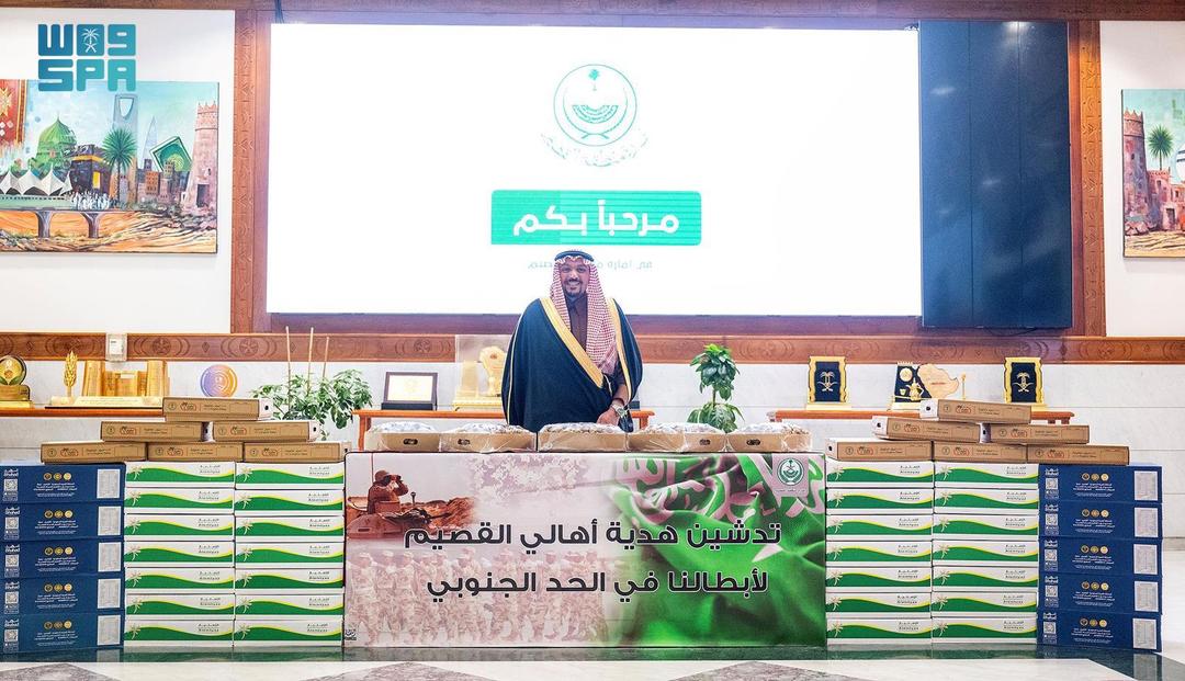 دشّن صاحب السمو الملكي الأمير الدكتور فيصل بن مشعل بن سعود بن عبدالعزيز أمير منطقة القصيم، بمكتبه اليوم، هدية أهالي المنطقة لأبطال الحد الجنوبي، التي تتضمن شاحنات محملة بـ 145 طنًا من التمور، و 8900 كرتون مياه، التي ستتوجه إلى مناطق الحد الجنوبي دعمًا وتقديرًا لجهودهم وأعمالهم.