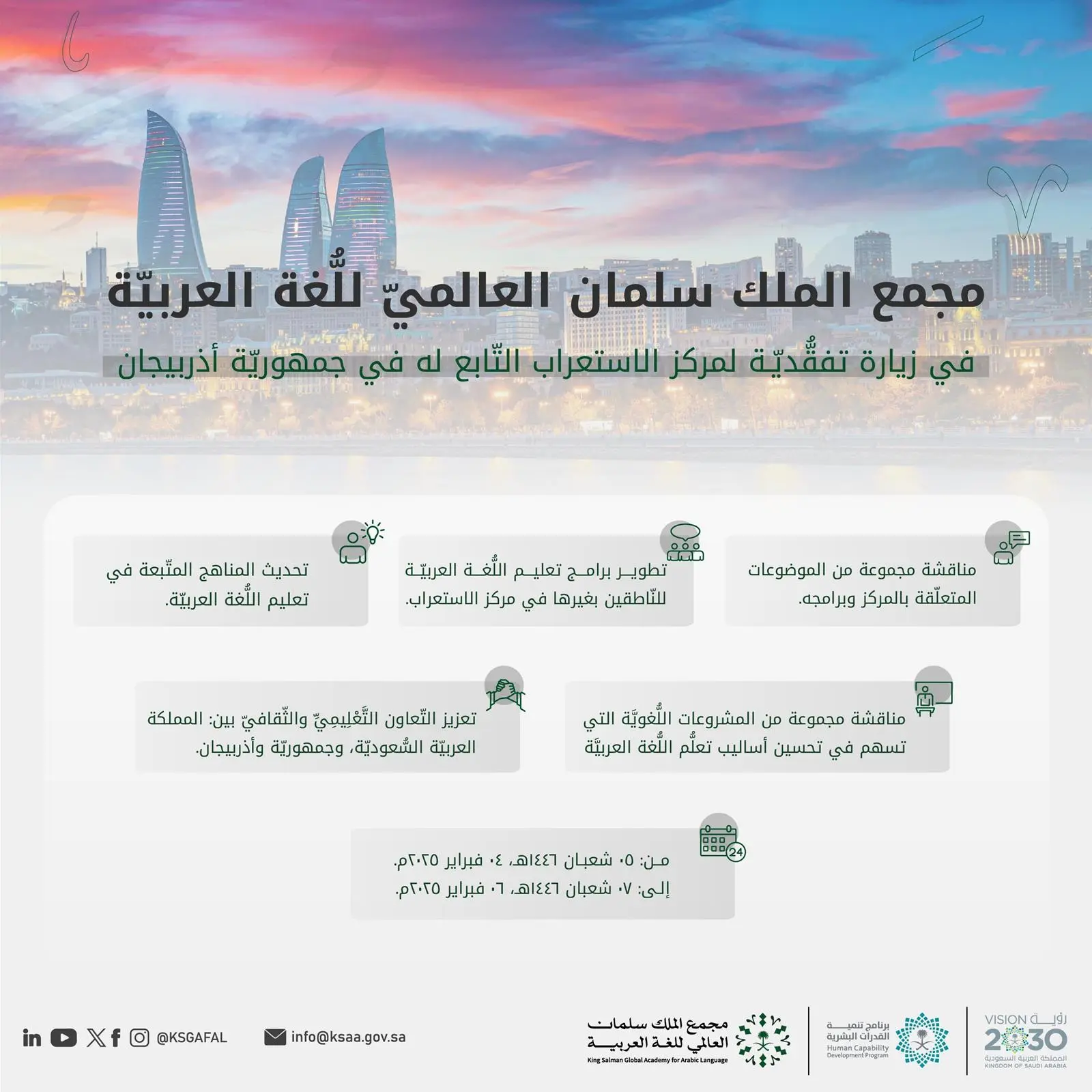 بدأ وفد مجمع الملك سلمان العالمي للُّغة العربيَّة اليوم، زيارته لـ “مركز الاستعراب” التابع له في جمهورية أذربيجان، وذلك في إطار التَّعاون الثقافي والمعرفي، ودعم الجهود المشتركة لنشر اللُّغة العربيَّة وتعزيز حضورها في المجالات التعليميَّة والأكاديميَّة الدوليَّة.