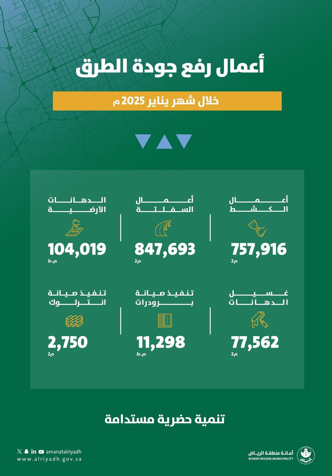 تكثّف أمانة منطقة الرياض جهودها في رفع جودة الطرق من خلال أعمال صيانة شاملة نُفذت خلال شهر يناير 2025؛ بهدف تعزيز كفاءة البنية التحتية وتحسين مستوى السلامة المرورية.