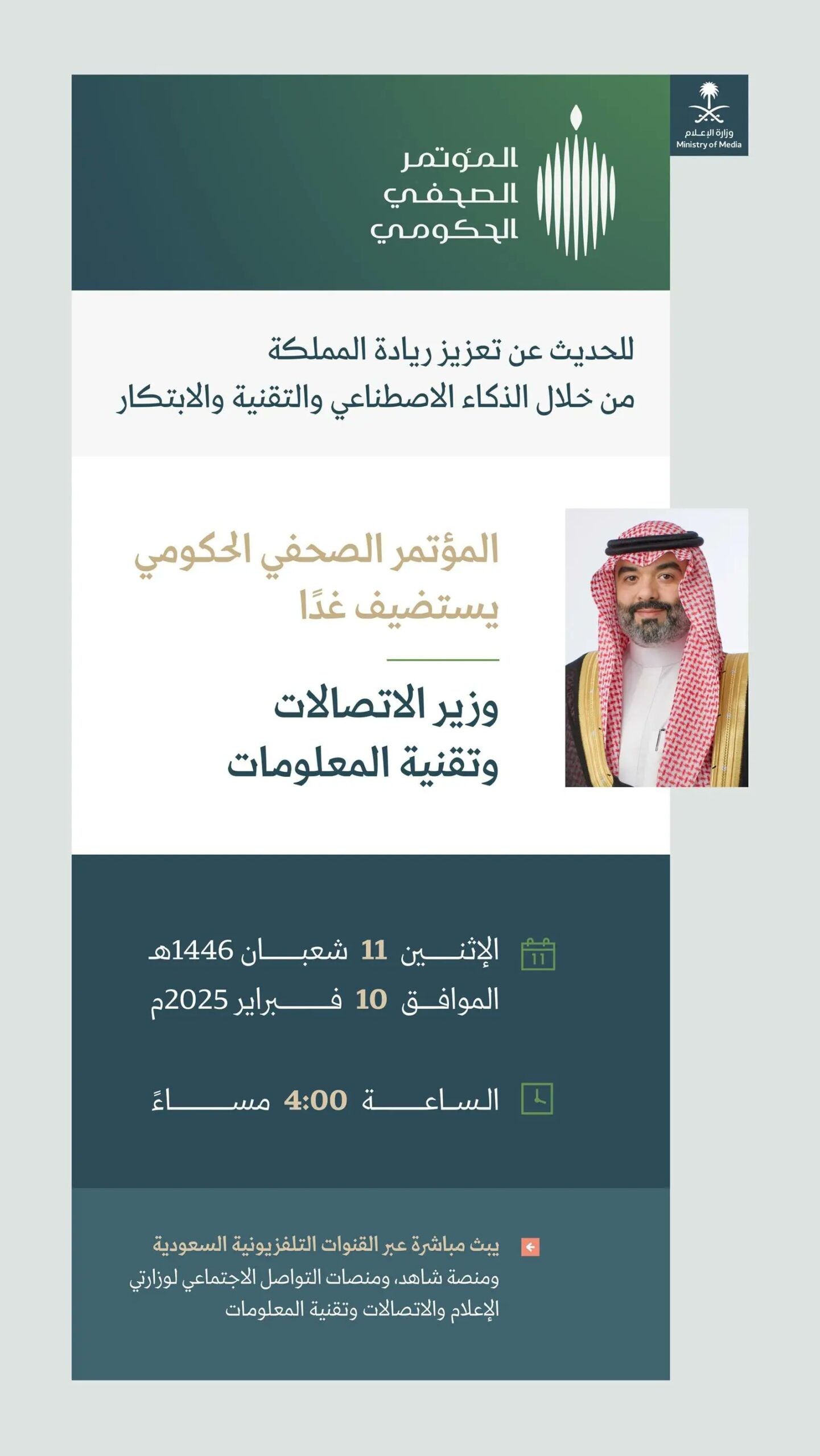 يعقد المؤتمر الصحفي الحكومي يوم غد الاثنين الموافق 10 فبراير 2025م بمشاركة معالي وزير الاتصالات وتقنية المعلومات المهندس عبدالله السواحة، الذي يتناول موضوع تعزيز ريادة المملكة من خلال الذكاء الاصطناعي والتقنية والابتكار.