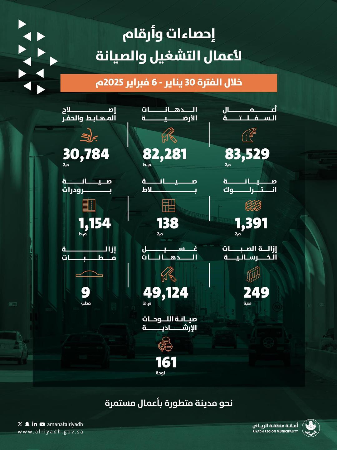 نفذت أمانة منطقة الرياض أعمال تشغيل وصيانة مكثفة خلال الفترة من الثلاثين من يناير حتى السادس من فبراير 2025، ضمن جهودها المستمرة في تطوير البنية التحتية وتحسين المشهد الحضري للمدينة.