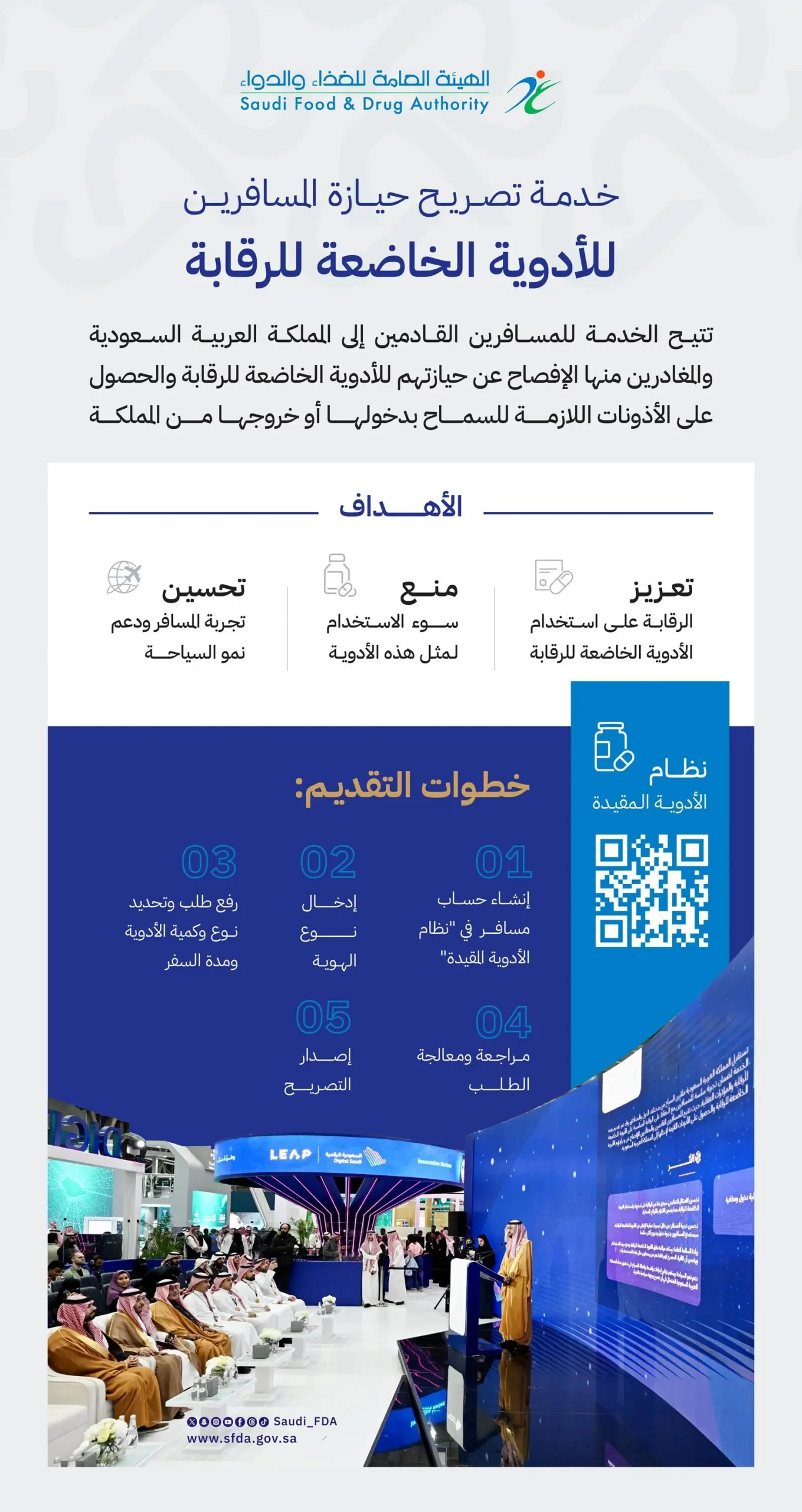 كما ستسهم في تحسين تجربة المسافر ودعم نمو السياحة من خلال تبسيط عملية الإفصاح عن الأدوية الخاضعة للرقابة؛ مما يمنح السائح تجربة دخول وإقامة وخروج أكثر سلاسة، ويعزّز وجود المملكة كوجهة مهمّة على خارطة السياحة العالمية بما يتماشى مع مستهدفات رؤية المملكة 2030.