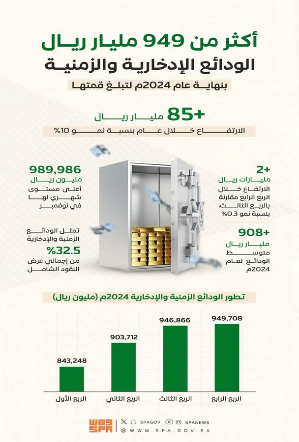 أكثر من 949 مليار ريال الودائع الادخارية والزمنية بنهاية عام 2024م لتبلغ قمّتها